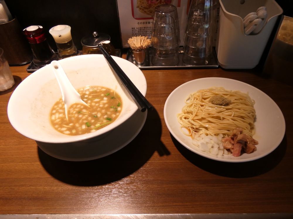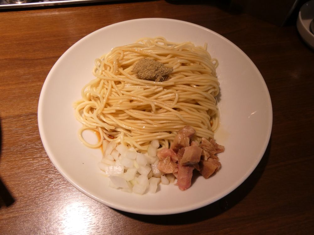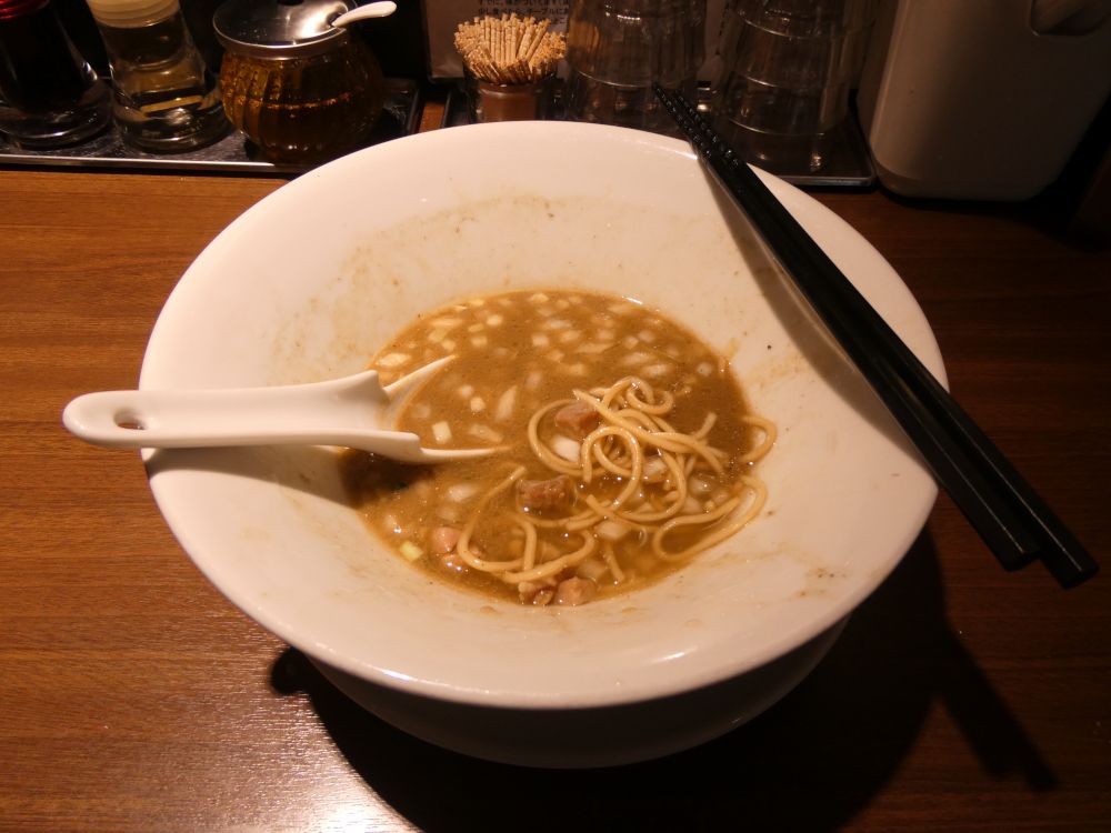 烏賊煮干スープと言っても鶏白湯の甘味が煮干の苦みを抑えたが、この味なら万人受けと言える。しかも確かに濃度が高い。ストレート中太麺は相変わらず歯切れと絡めがよい。途中に山椒オイルを投入。今日のレアチャーシューはちょうどいい味だね。