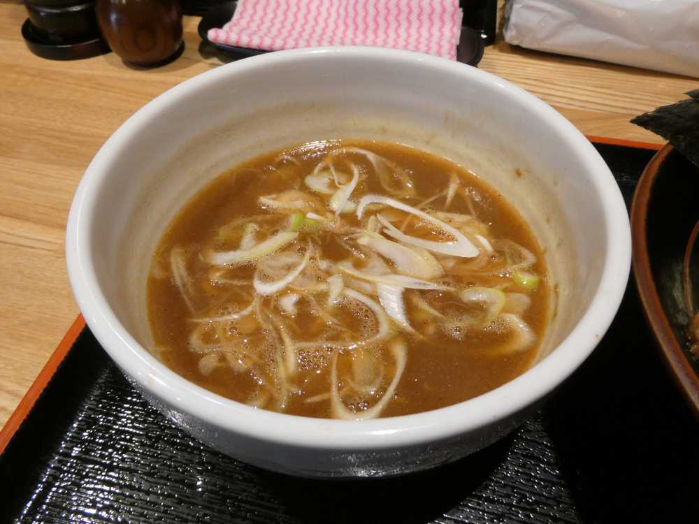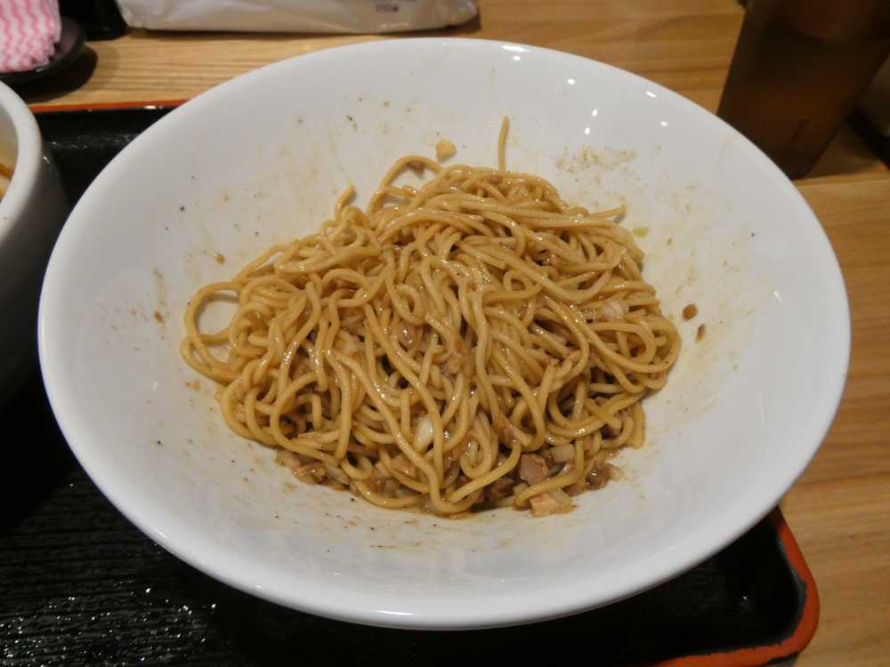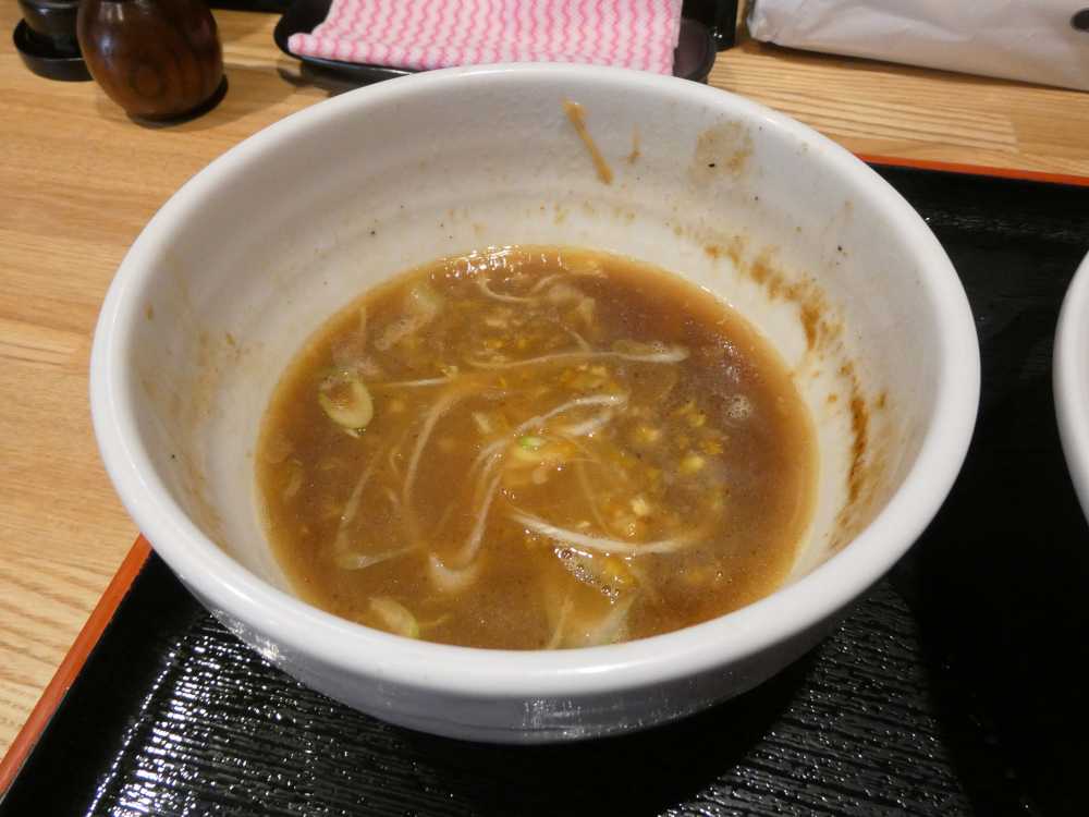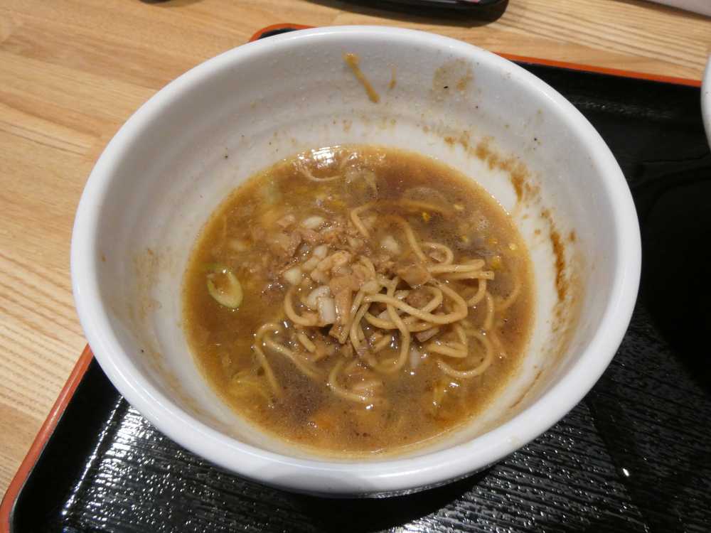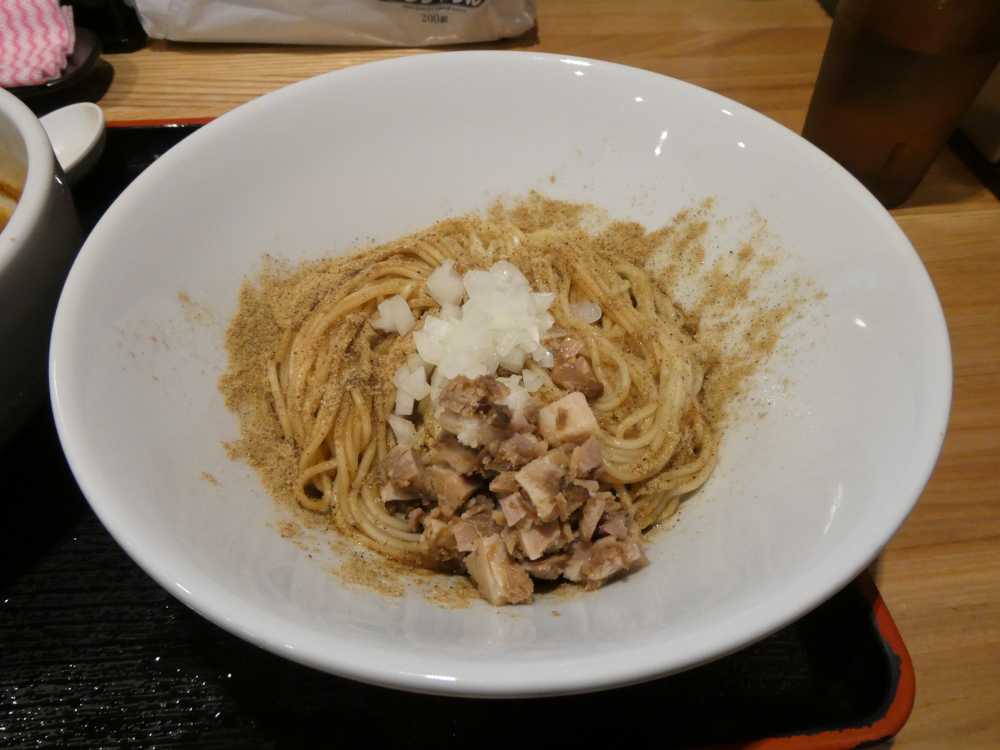 少し縮れのストレート細麺は茹で加減がカタメで、もちもちして絡めもよい。醤油タレも濃いめで、魚粉とタマネギと合っている。途中につけ麺のように麺を食うのだ。このタレもつけ汁との相性が良い。