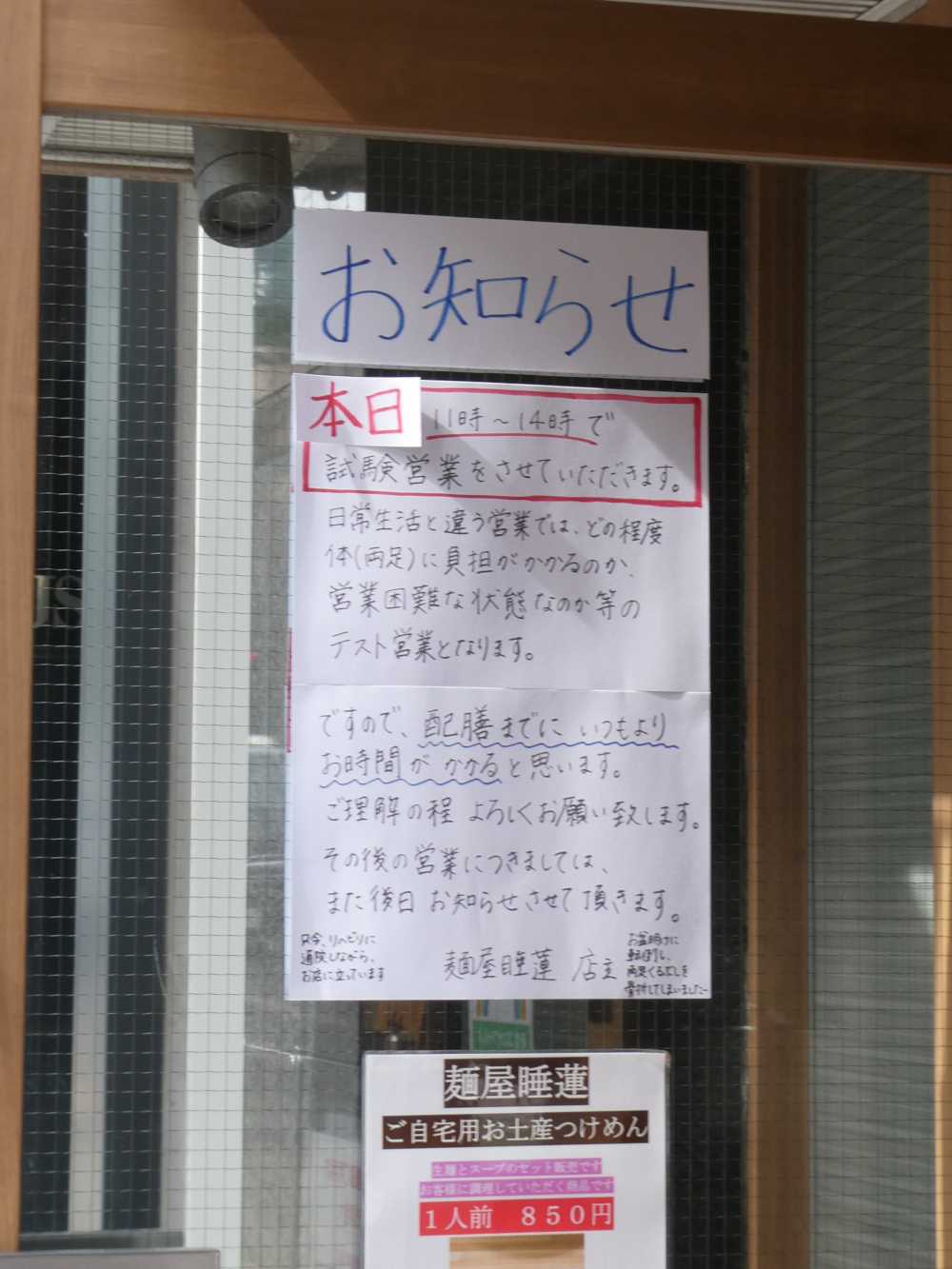 麺屋 睡蓮 ​」は​ 月館店主がバイク事故で両足骨折したため8月中旬から休業 ​していたが、​ 先週木曜日 ​から試験営業で再開したのだ。月館店主の通院で営業するかどうかについては事前にツイッターで確認したほうがよいが、​ 今日に営業すること ​が確認できた。ということで、​ 3ヵ月ほどぶり ​の睡蓮へゴー