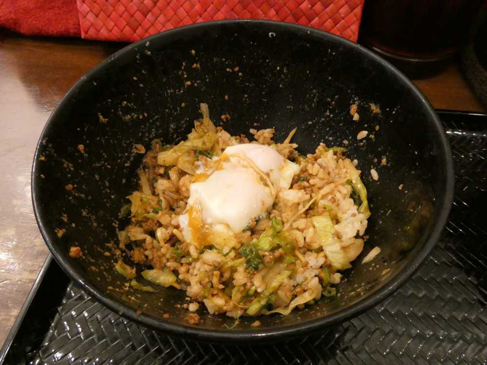 ご飯をかき混ぜ、少し食べ進めたら、温玉をかけ、さらにかき混ぜた上で、ガーリックパウダーと山椒を大量に投入し、完食。