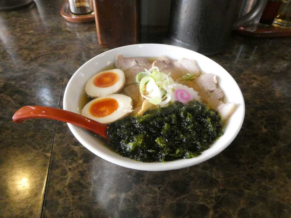 ほどなくご対麺。醤油味の煮干スープは流行ってきた味に比べればあっさりしたがコクがある。岩海苔の旨味も徐々に煮干スープの旨味を強めたようにも味わえる。中太ストレート麵は絡めもよいしコシもある。ロースチャーシューはほろっと崩れるが固さがちょうどよい。チャーハンの味とスープとも合っている。