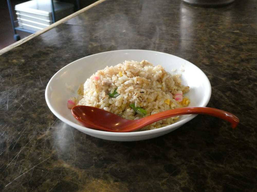東店主は女将さんが食券を受け取った後にすぐチャーハンを作り始めたということで、まずはチャーハンの登場。腹が減ったので、まずいただこう。初訪問の時に比べ味付けが薄目になったが、今のわしにとってちょうどよい。