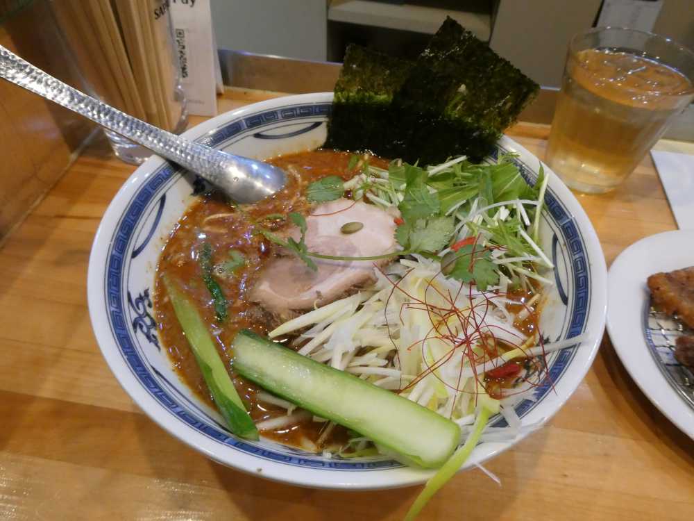 金のゴマタレはやはり濃密で香ばしいし、旨味もしっかりしており、スーパーホットの辛さとのバランスがよい。ストレート細麺は絡めと歯切れが良く、金のゴマの担担スープと合う。金の担担麵は野菜の量が結構多いほうだ。