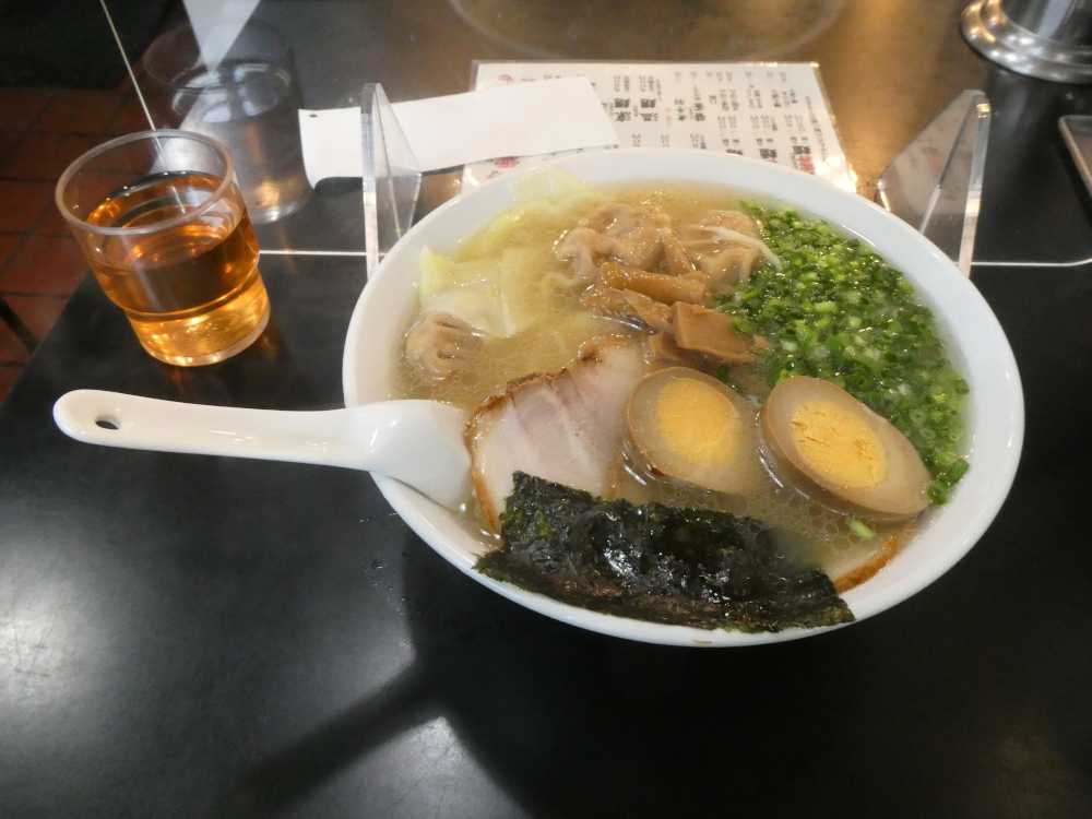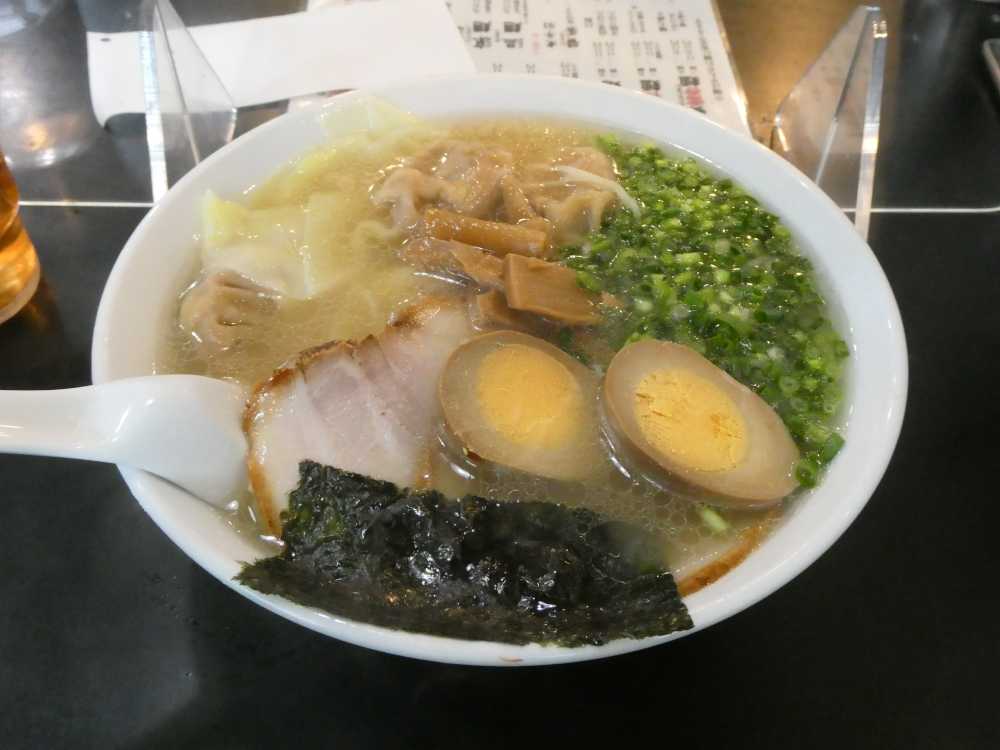 塩と醤油の中間と言われる白醬油タレを使用する豚骨スープはコクがあり、塩気が効いているが飲みやすい。青ネギも薬味としてスープと合う。縮れ細麺は茹で加減が柔らかいが、適度なコシがあり、絡めもよい。肉ワンタンは肉餡も大きいし、皮もちもちした。チャーシューは蓮切りだが味付けもいいし柔らかい。醤蛋はかなり濃いめの味付けの煮卵だが、スープの味と対照的でむしろ味が合う。