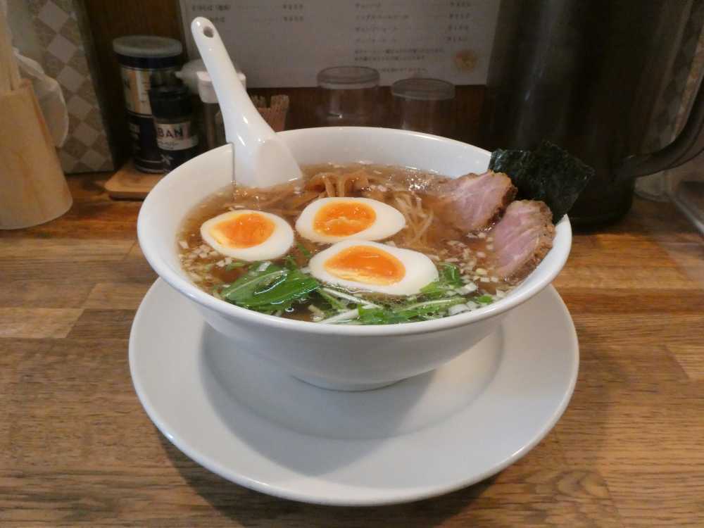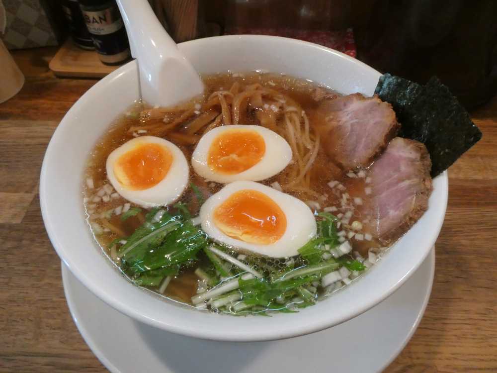 醤油スープはあっさりしながらコクがある。オープン当初は鶏ガラの味がメインだが今魚介風味も溢れている。少し縮れの中細ストレート麺はしなやかでスープとの相性がよい。赤身がメインのチャーシューはほろっと崩れるぐらいで柔らかいし、味付けもよい。もともと半玉が入っているが、今日のわしはもう一個が必要かな。
