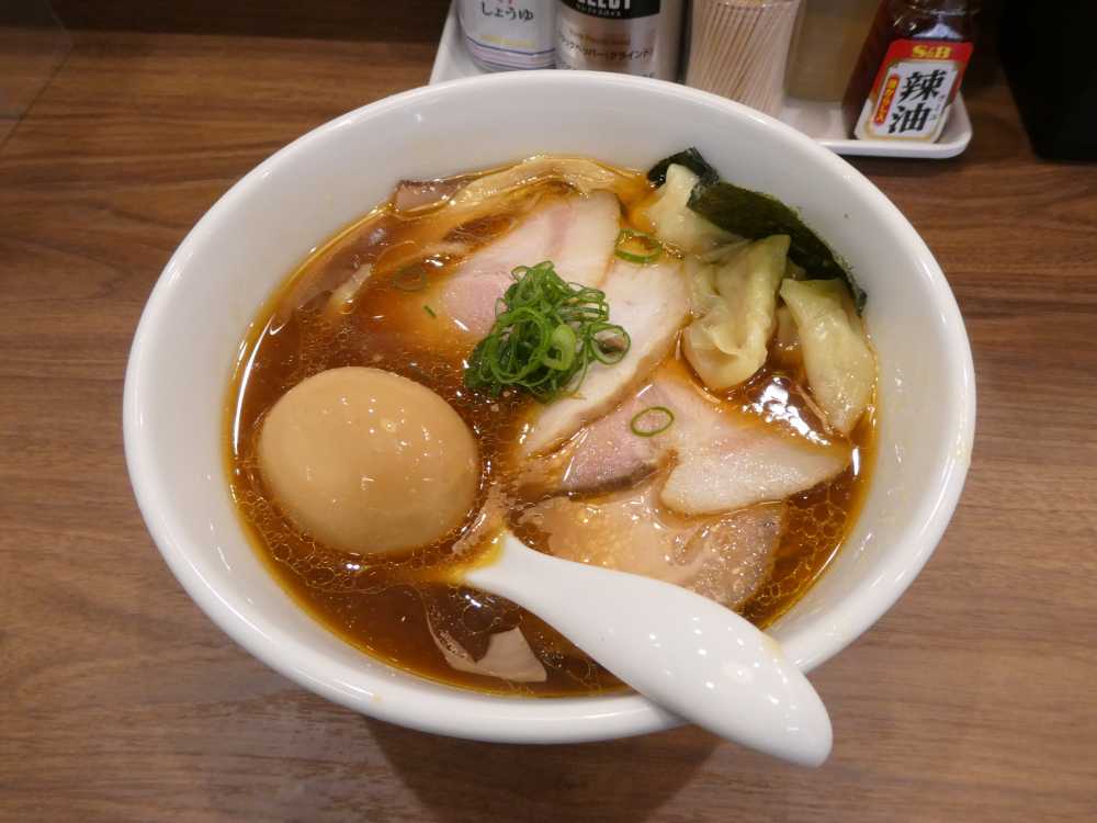 しばらく待ったらご対麺。鶏油の張り方とスープの色はAKEBIと結構似ている。実際に飲めば、醤油スープは鶏出汁の旨味と鶏油とのバランスが結構AKEBIに似ていると味わえた。全粒粉使用の細ストレート麺は菅野製麺所によるものらしくて、喉越し、スープとの絡め、歯切れがよい。チャーシューはバラとモモなどの異なった部位のものを使用し、いずれも歯ごたえと味付けがよい。ワンタン中華そばは一押しらしいが、ワンタンは皮がもちもちしたのに対し餡があまり存在感がない。