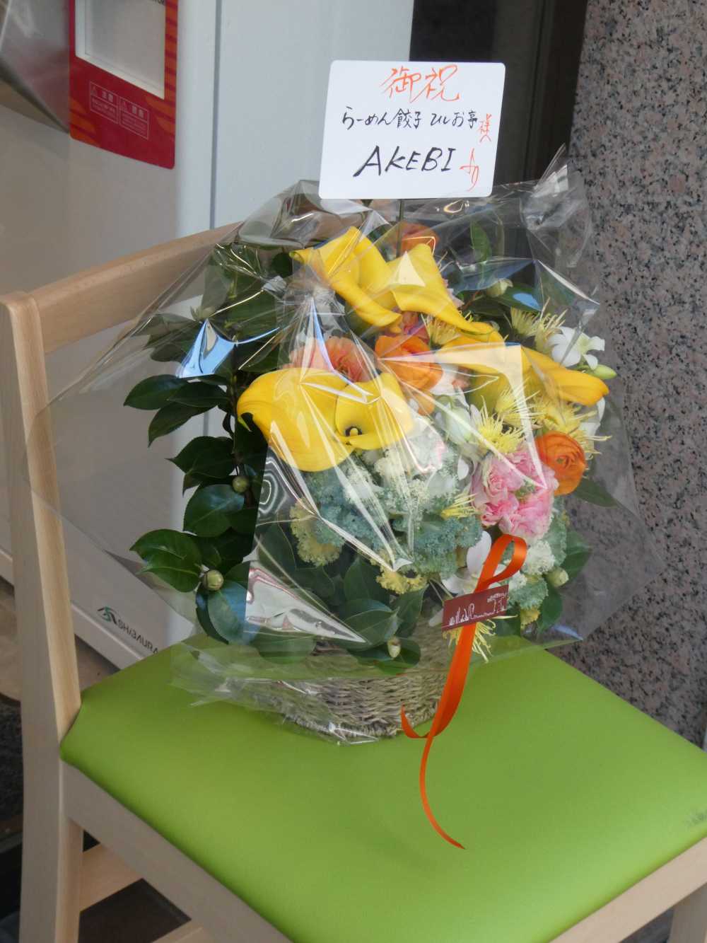 入口にAKEBIからの花が飾ってある。ほぼ満席。特製ワンタン中華そば、特製手作り焼き餃子3個の食券を購入してから、指定された席に着席。餃子はニンニクあり、なしから選ぶってことで、ありでお願いした。それにしても、店は​ 蝙蝠 ​の跡地にあるとはちょっと寂しい。蝙蝠もいい店だけではなく、兎に角の​​ 創業地 ​​で今駐車場になった場所の隣にあった。個人的に蝙蝠に長くやってもらいたかったが…。