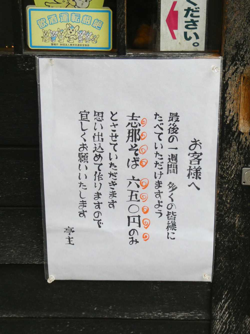 入口の前にこのようなお知らせが掛けられてある。暖簾もまだ掛けていないが、おやっさんから入店の許可を得たため入店して着席。もちろん、支那そばを注文。おやっさんから、いつものようにチャーシューができなくてごめんねと言われたが、たぶんそういうことになるだろうという覚悟ができていると返事した。支那そばを注文。