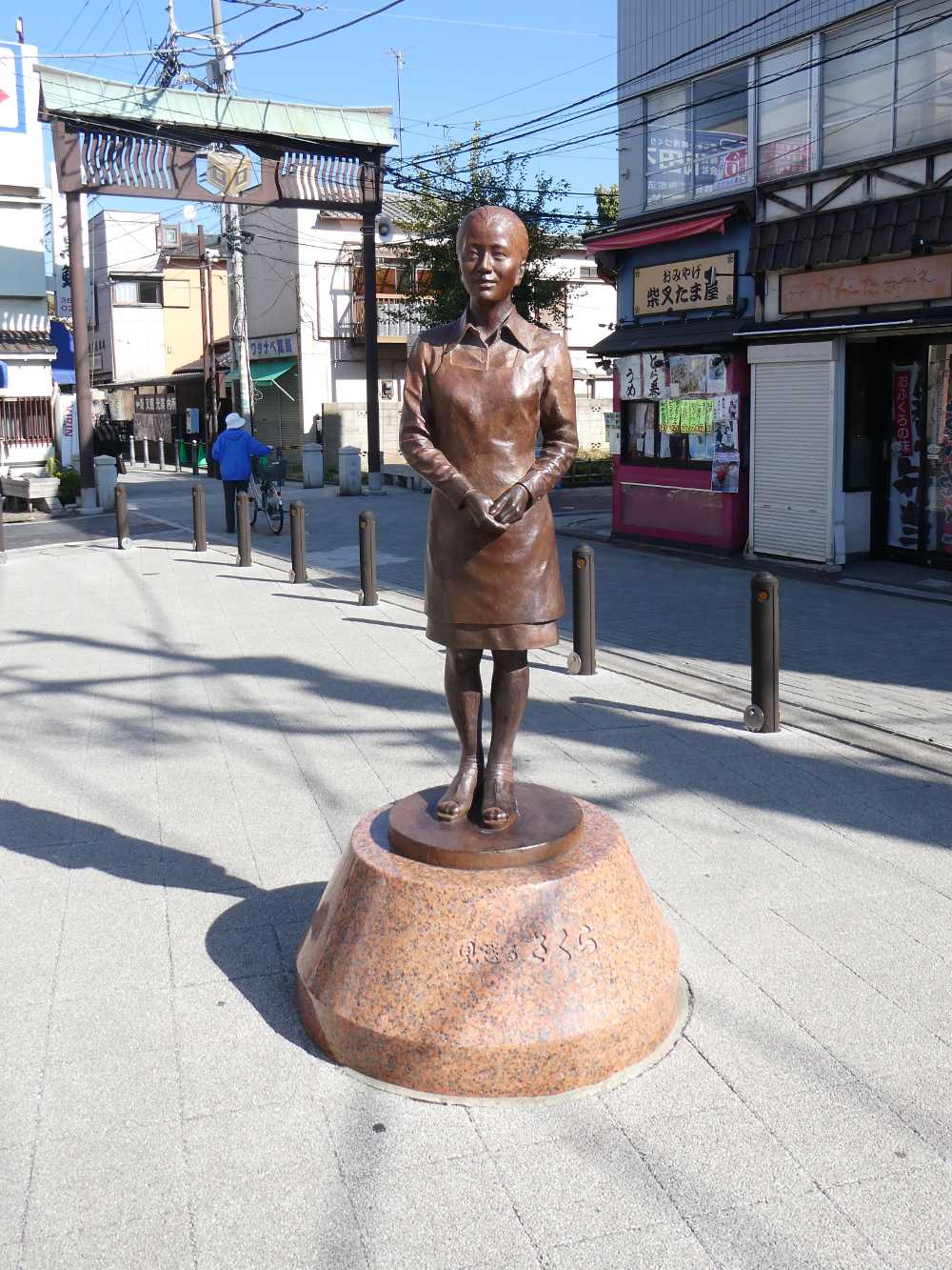 駅前にすぐ『​ 男はつらいよ ​』の主人公である「フーテンの寅」こと車寅次郎、つまり寅さんの銅像が見えた。1999年に建てられ、フーテンの寅さんの像とも言われる。