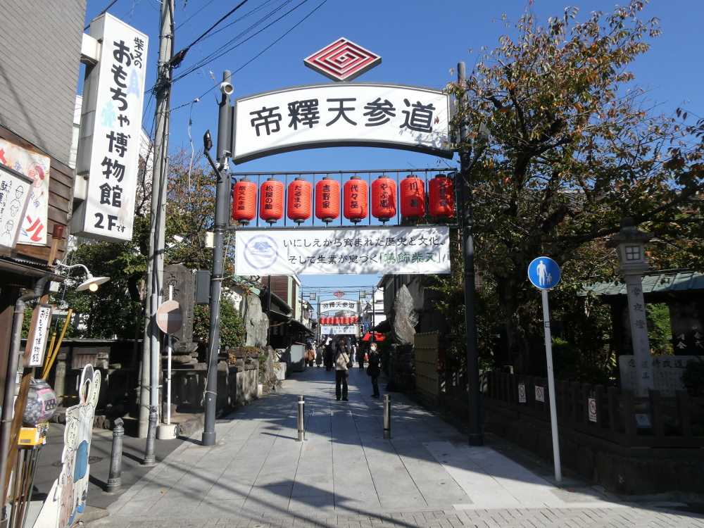 柴又帝釈天への参道。近くの常夜灯は寅さんを演じた渥美清が寄贈したものである。