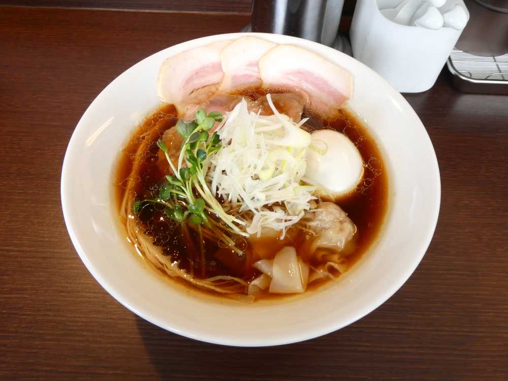 醤油スープは油も効いているしタレも濃いめだが、やはり鴨出汁を中心とした清湯出汁の旨味がかなり出ている。白ネギはスープと合う。醤油タレが薄めのいりこそばに味が強いタマネギを使用するっていう味の差別化を図る意図もわかった。手もみ麺はスープとの絡めもいいしコシもある。ワンタンは皮が薄めだが餡が大きくて薬味とも合う。チャーシューは歯切れと味付けがよい。味玉も黄身が濃いめでうまい。