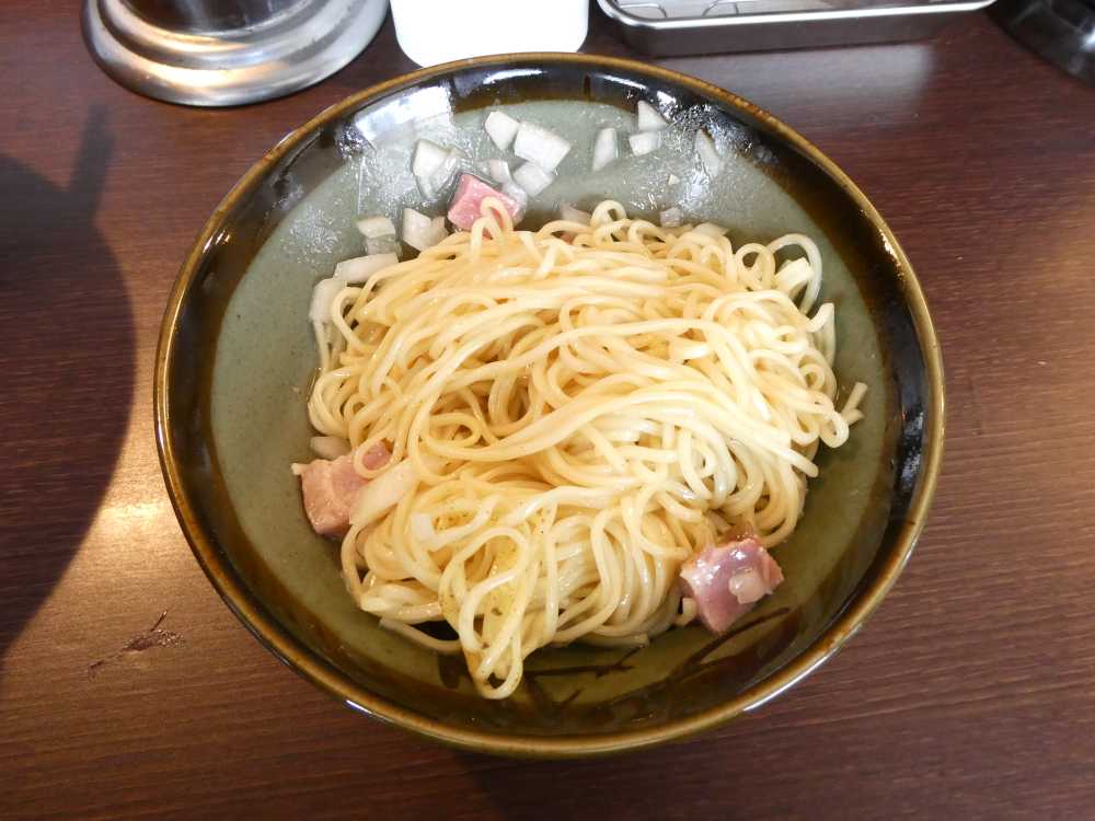 細麺は持ち上げやすくて、モチモチした食感だ。タレと山椒もマーチしている。普段ならわしにとって結構量が多いほうだが、かなり腹が減っている今日のわしにとってちょうどよい。