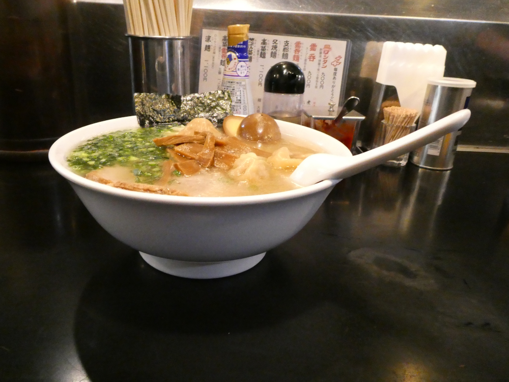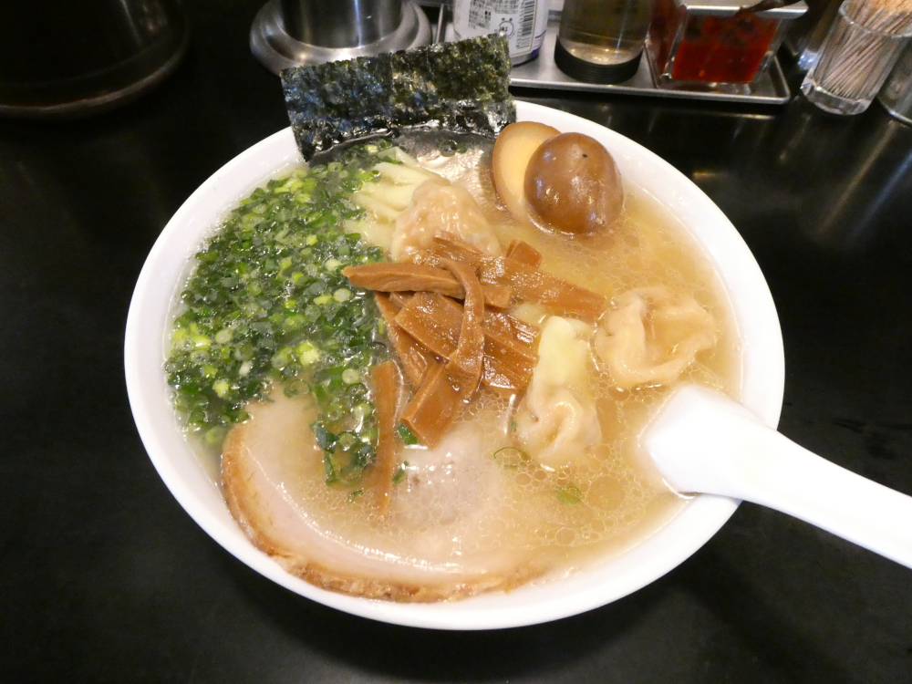 白醤油を使用する豚骨醤油スープはかつて塩と醤油の中間と言われるが、豚骨出汁の臭みがなく、塩気が強調されたのに食べやすい。細縮れ麺はスープとの絡めもいいしコシもある。ロールチャーシューはやはり大判で歯切れや味付けもよいよい。目当ての肉ワンタンは皮がもちもちして、肉餡が大きい。
