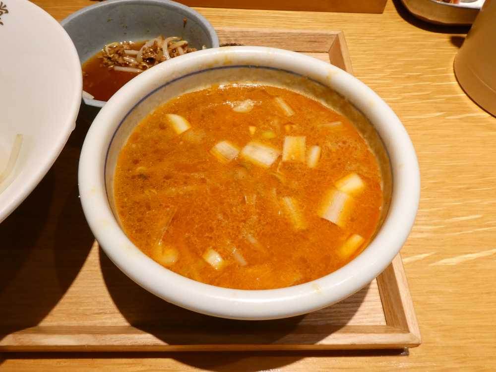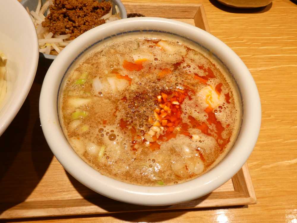ラー油も色がはっきりしているが基本的に辛くない。つけ汁はゴマタレの味も出ているが、今まで二階堂が提供した担々麺に比べ、醤油ベースで出汁と醤油タレの味が強調される。鶏チャーもつけ汁に浸かっている。