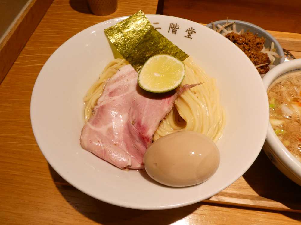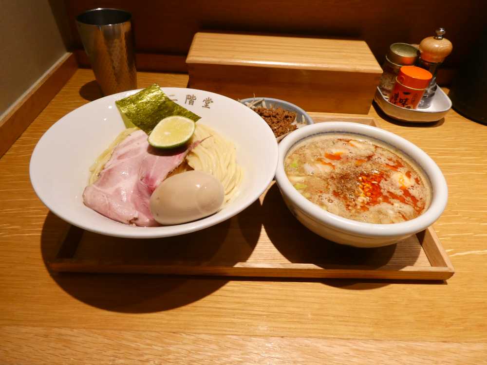 たどり着いた結果は原点の「中華そば 二階堂」だ。何を食おうかと思ったら、​ 限定 ​もあるってことで、担々つけそば、味玉の食券を購入してから着席。スタッフに食券を渡した際に、中盛をお願いした。