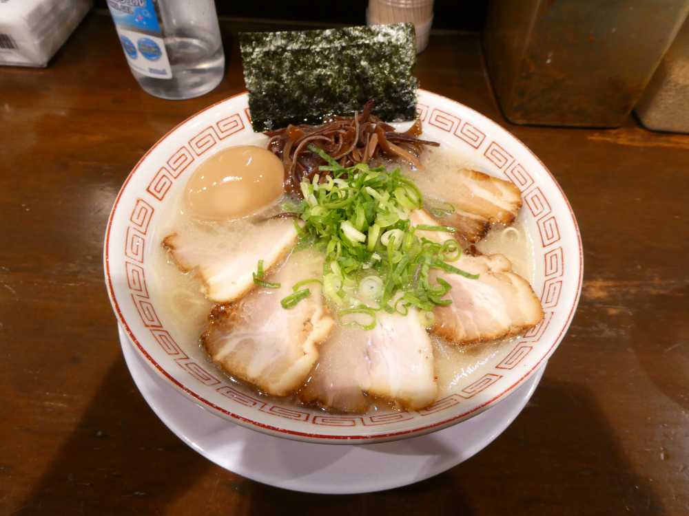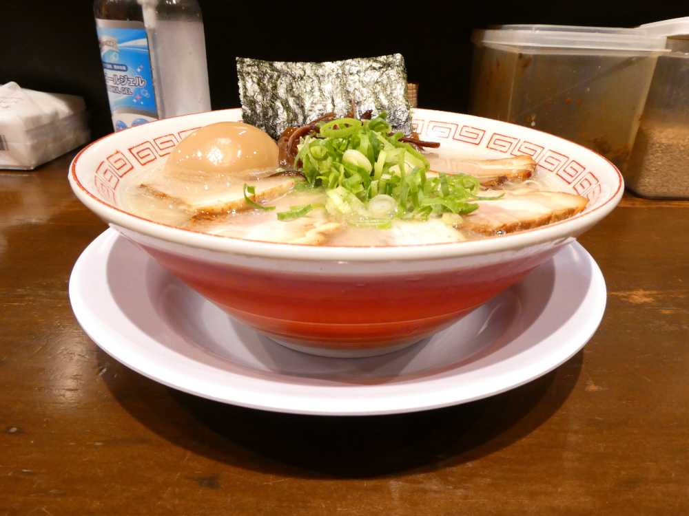 創業時の田中商店だけではなく、オープン当初のここの味に比べても粘度や臭みがかなり抑えられたが、豚骨の旨味が依然しっかりしている。薬味も効いているがやはりおろしニンニクを大量に投入しなくてはならない。ストレート極細麺はスープとの絡めや歯切れがよい。チャーシューはバラ肉で、味付けと歯ごたえがよい。博多長浜ラーメンのチャーシューはバサバサするというイメージがあるが、フクフクのチャーシューは結構うまいほうだ。