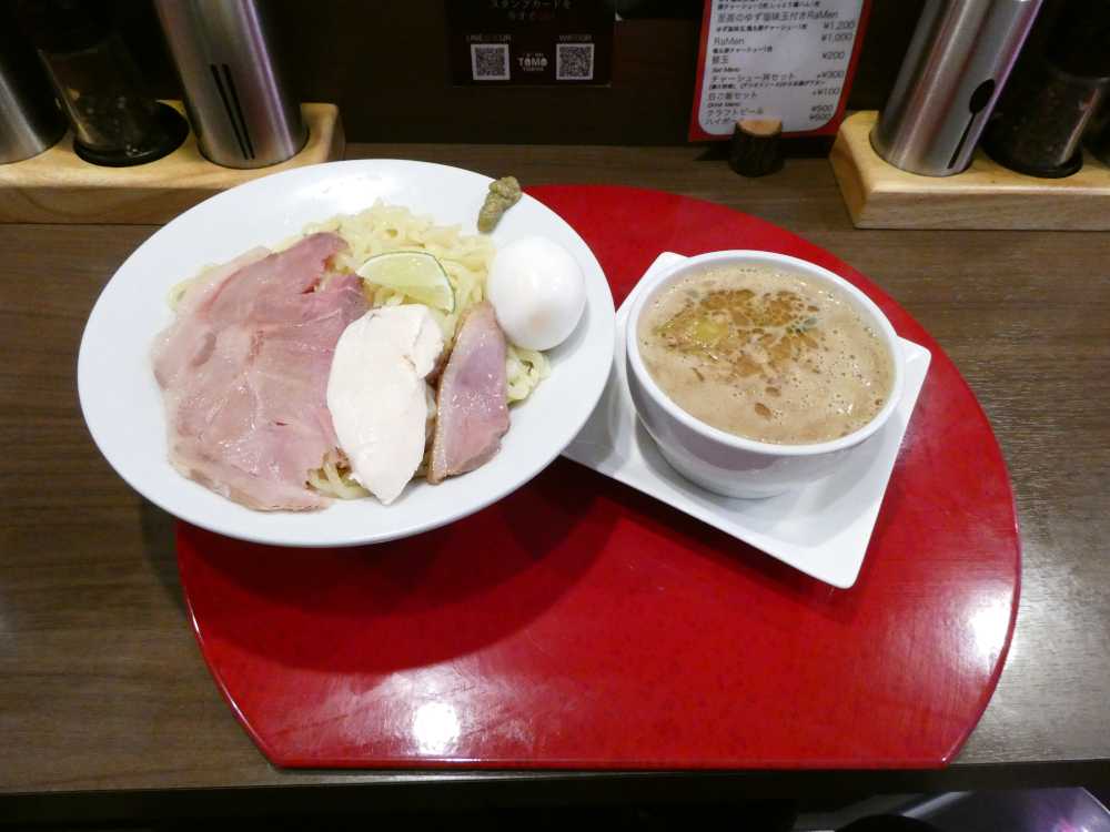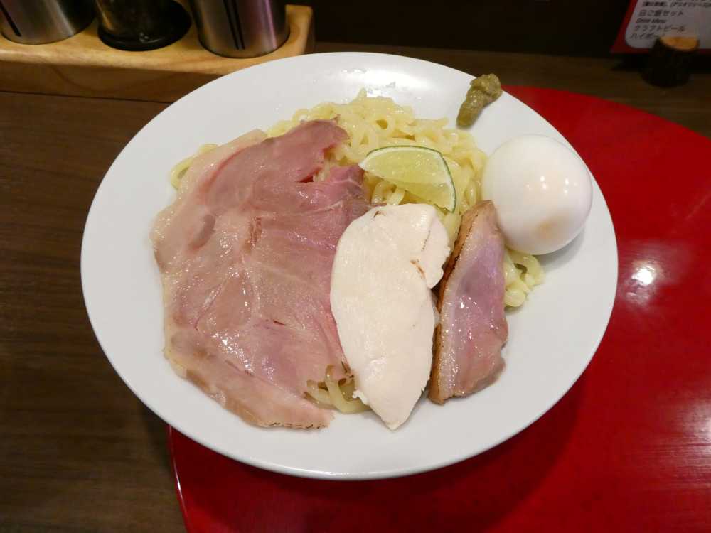 縮れ中太麺は平打ちで厚みのあるもので、濃厚のつけ汁との絡めもいいし、コシもある。鴨チャーシューは歯ごたえや味付けがよい。鶏むねチャーシューは柔らかい。レアチャーは大判で薄切りで歯切れがよい。途中にライムを麺の上に絞り、また柚子胡椒をつけ、麺でつけ汁を食うと味変に楽しめた。