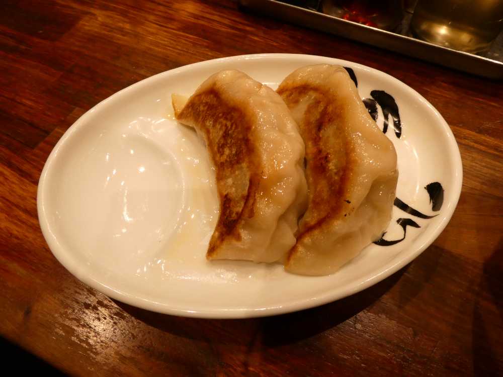 次は心の味餃子2個のご登場。底がパリパリまで焼いた大きい餃子は皮がもちもちし、味付けしている餡も大きい。