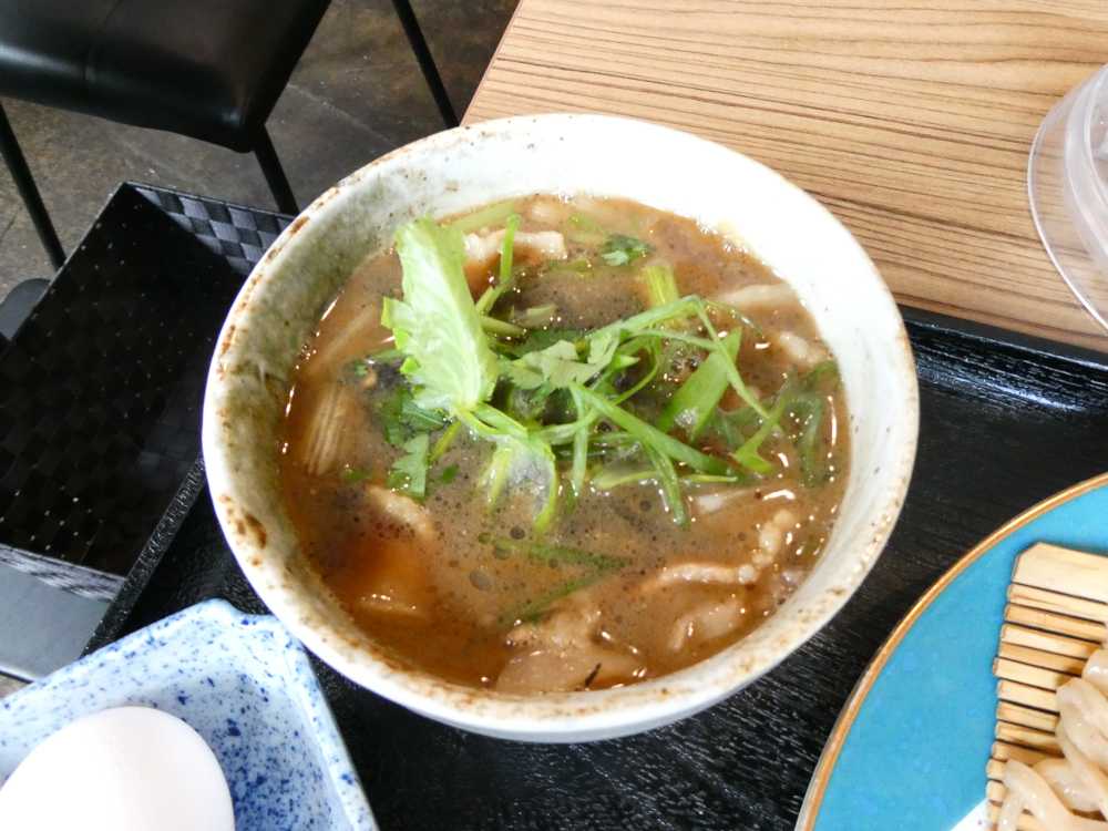 つけ汁はタレが蕎麦のつゆと同じ味で、ラーメン屋の魚介出汁のようなコクで、なかなかいい。ネギや豚肉も麺と一緒に食うのがいい大きさなので挟みやすい。