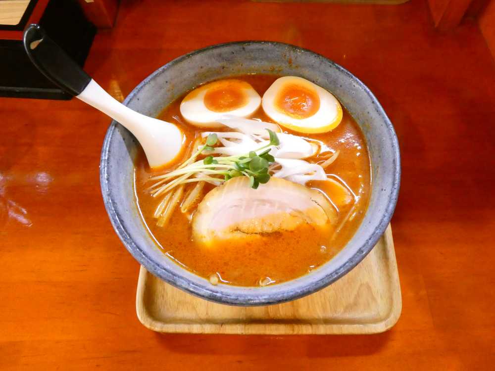 辛さに慣れているせいのため、個人的にちょうどよい辛さと味わえた。辛さと濃厚な味噌スープとの相性も良い。縮れ中細麺はスープとの絡めが良い。今日のロールチャーシューは脂身と肉のバランスがよい。