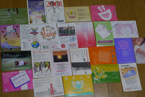 毎年、年末になると「どんな年賀状を出そうか」と悩むのが恒例になってしまった。きっかけはちんころと結婚した時のお知らせのハガキだった。なんとなく広告コピーの本が好きで読んでいたこともあり「自分なりに言葉で伝えよう」というところから始まる。いろいろと考えてハガキを作った。さらに年賀状は毎年「謹賀新年」とか「あけましておめでとうございます」だけじゃ、つまらないよな・・とか考えたりして何かその時に考えていることを書こうと考えて、「言葉の年賀状」を作り始めた。もう30年近くこれをやっている。「私たちは元気で過ごしています」ということを伝えられたらいいな、と思って書いている。とは言え、私は実際にはコピーライターをしている訳でもないし、下手の横好きで書くだけなので数年経って読むと「なんじゃこりゃ」というのもあって気恥ずかしくなるが、でもこの時はこんなことを考えていたんだな、ということは思い出せる。自己満足の世界だが、これがけっこう面白かったりしている。今はDTP→オンデマンド印刷などが存在するので印刷代も実にリーズナブルになったが、希瑛が生まれた時のお知らせのハガキを作った頃はカラー写真を使うと写真を4色に分解して、文字は写植を外注して・・などとやらなければならなかったので300枚ほどのハガキを作るのに7-8万円かかった。フルカラーでハガキ、というのは贅沢な時代だったのだ。ということで今までに出した年賀状中心の挨拶状の数々です。今年の年賀状も・・。