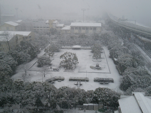 東京でも珍しく大雪が降っている。もちろん雪国育ちの私には「雪なんてこんなもんじゃないよ」と思うが、東京としては凄い大雪だ。この冬の初雪が大雪になってこれから交通にも影響が出るのではないか。会社勤めをしている身としては、今日が休日で良かったと思う。それから練習も・・昨日昭和の森に行っておいて良かった。LSDもやっておいて良かった。しかし、雪の勢いが弱まらない。下の写真はベランダから見た眼下の公園だが、1時間で雪のつもり具合が少し判る。こんなこと東京では珍しい。