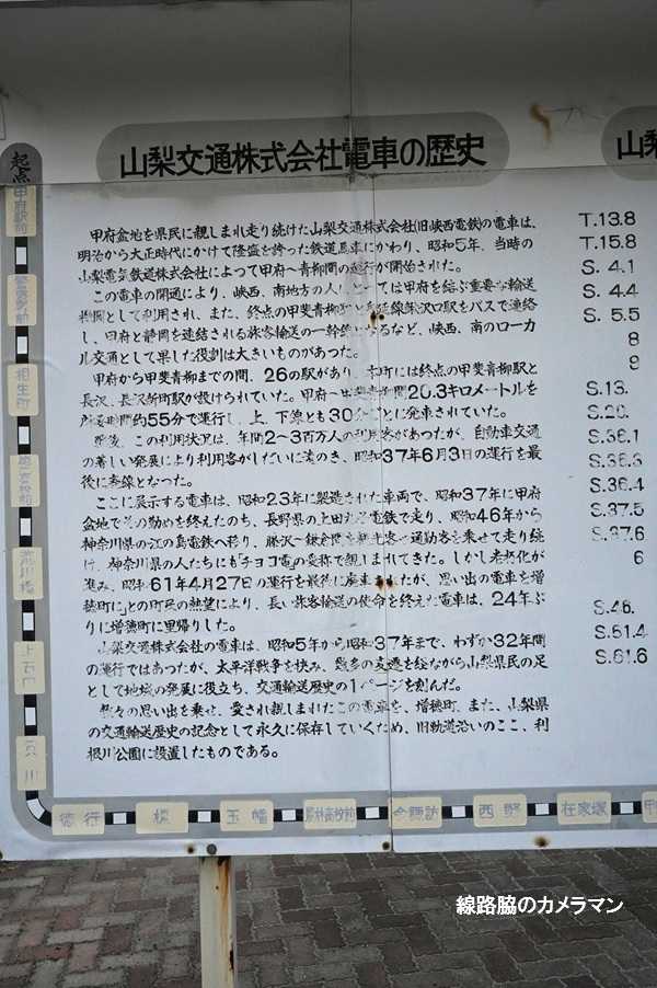 ●山梨保存車巡り(山梨交通モハ7)次の保存車巡りは、甲府から南に13kmほど行った増穂町の利根川公園にあった。元山梨交通の7形電車で、1948年(昭和23年)汽車製造東京支店製で2両が作られた。1962年に山梨交通が廃止されると同時に廃車となり、上田丸子電鉄に譲渡されモハ2340形となる。その後、江ノ島電鉄に移り800形となり現在表示の801号車となり1986年まで活躍した。社紋は山梨交通のもの。塗装したときの筆跡が浮き出ている。廃車後は当地に里帰りし、昔の線路脇に屋根付きで保存されている。山梨交通は1930年に甲府駅前から甲斐青柳まで併用軌道と専用軌道の20.2kmの全線単線、駅数28で山梨電気鉄道として開業したが、台風被害などもあり1962年に廃止された。何故か愛称はボロ電だった。行先標は江ノ電時代の形式に甲府駅前←→甲斐青柳の表示がある。中間扉や片運転台化は江ノ電時代に改造された。汽車会社製の台車。
