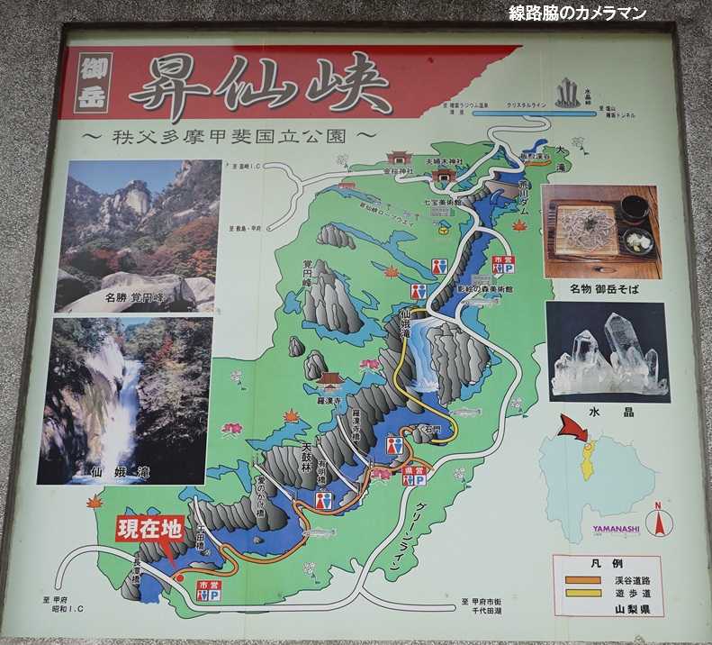 ●昇仙峡山梨の代表的な観光地である「昇仙峡」へは、甲府からくねくねとした山道を30分ほど走る。1953年に特別名勝に指定され日本5大名峡の一つでもある。よく見ると秩父多摩甲斐国立公園となっており、埼玉、山梨、長野、東京と広大な中にある。昇仙峡とは、下流の長潭橋(ながとろばし)から仙娥滝の全長5㎞の渓谷で、侵食された大きな花崗岩や安山岩の奇岩が至る所に見られる。到着した入り口の長潭橋からは平日は上り一方通行で行くことができるが、シーズン中の土休日は車規制が実施され歩行者専用となる。ここからだと全ルートを往復することになるので、中間の駐車場に向かう。昇仙峡入り口の500円の駐車料金を支払い渓谷散歩とする。ここでも半数は外国人のようだ。沿道には数年前まで営業していたと思われる飲食店や大きな天然石が放置された土産店が廃墟となっている。これもコロナのせいだったのだろうか。 木の根っこが化石化した。巨大な赤石。盗まれないのか他人事ながら心配。眼下には大きな岩の間を豪快に流れる水に圧倒される。誤って滑り落ちたら這い上がるのが大変そうだ。上を見上げると、ここにも巨大な岩山(覚円峰)が見えるが、今日は曇り空なので半分は霞んでいる。木々の葉が少し色付き始まっているので、一週間ほどすると大混雑になりそうだ。これは「石門」と言うせり出している岩だが、先端は下の岩にくっ付いていない。橋が見えてきたのでここで折り返しをする。ハートっぽい形。再び車でロープウエイ乗り場まで行ってみる。これは初代ゴンドラのオールリ号。1964年に作られたロープウエイは、5分で山頂に行くことができるが残念ながら今日は曇り空で頂上はキリの中らしいので諦め。この先の「仙娥滝」に行くのだが、付近には多くの宝石店や飲食店が並んでいる。階段を降りると高さ30mの滝が現れる。滝の入り口の蕎麦屋に立ち寄りランチとなった。生きたイワナの塩焼きが人気のようだ。