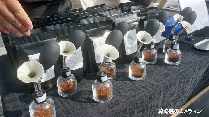 伊豆の近隣や沖縄など全国8都府県から集まった22店のコーヒーショップがそれぞれの特徴をアピールしながら声掛けをしている。