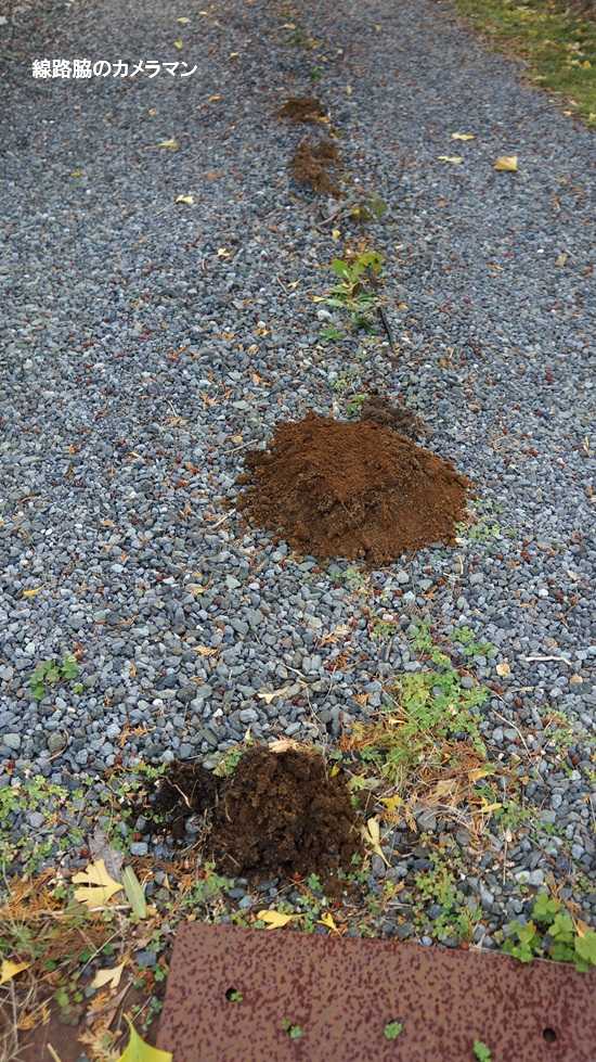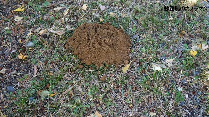 すぐにモグラの仕業だなと思い、周囲を調べてみると数カ所に土の盛り上がりが確認された。