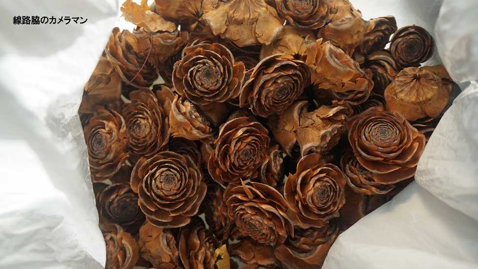 落ち葉と共に松ぼっくりも落ちてきて収穫となる。
