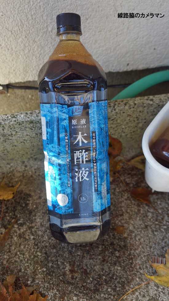 ネットで調べてみるとモグラ撃退方法には音や匂いが有効とのことなので、手元にある木酢液を通り道に流し込んでみる。