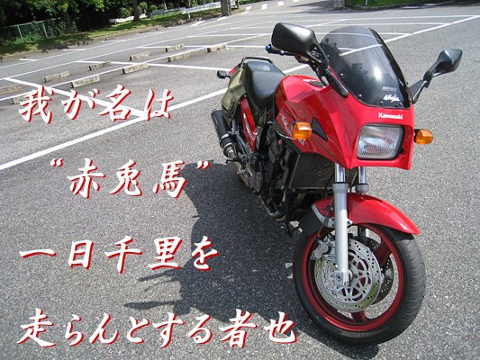 ふと、思いました…他人が走った地図の軌跡を見て、いったい誰が楽しむんだろうかと……たった一人でもイイんで、いつか興味持ってくれてる方が訪ねてくれればなぁ…って今は考えてます…そんなわけで(?)遅ればせながら、PRフォトを掲載させて頂きました。"赤兎馬(せきとば)"とは、「三国志」中に登場する、一日で千里を駆けると言われた名馬の名前です。ですので、ココでは"赤兎馬"を名乗っておりますが、ワタシの名前と言うより、我が愛機<Kawasaki GPZ900R>に付けた愛称ってのが本当のトコロです。改めまして、以後よろしくお願い致します( ̄▽ ̄)ゞ