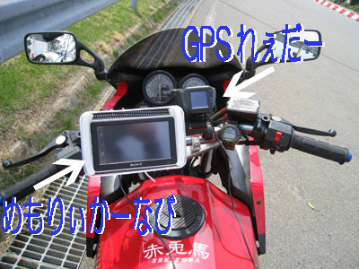 こんばんは。日にちをまたいでますけど、昨日に引き続き、「日本海まで、ひとっ風呂浴びに行こ!」(往路の2)をお送りします。さて、今回の“赤兎馬”の仕様はというと、こんな感じです。右に付いてるのが、GPSレーダー(カー用品屋さんで普通に売ってるやつ)、左に付いてるのが、メモリーカーナビ(家電屋さんで買った小さめのやつ)。ともに、バイク用のステーに、自作の固定具で、取り付けてます。自作と言えど、高速道の走行でも、“ほぼ”ズレたりしない「自信作」です。バッテリーに車用のシガーソケット&ヒューズ&スイッチを増設し、そこから電源供給を行っております。さて、今回GPSレーダーを装着したのには、訳がありまして…まぁ、皆さんが思われている使い道の他に、GPSレーダーだと、リアルタイムに走行速度が表示されるんで、そのスピードを確認したかったためであります。どうも我が“赤兎馬”のスピードメーターは、ちょいと高めの表示がされているようだったんで、実際のところどうなのかなぁ?って。(タイトな下りコーナーでも、気が付くと平気で80km/hも出てたりしてたんで…)で、計測したところ、な、なんと…10~15km/hも!実際は、遅かった…んです……。初めて“赤兎馬”で、高速道を走った時、らくらく1●●km/hを捻り出し、『さすがは元<世界最速>だゼ!』なんて、悦に入ってたのに、実際は… ( ̄□ ̄;)知らなきゃイイ事って、世の中にはあるんですねぇ…そんな“赤兎馬”のスピードメーター君にある種の不信感を覚えつつ、北陸自動車道 長浜ICを降り、一路、琵琶湖の湖岸道路を目指しました。天候は、走る先々で様相を変え、琵琶湖を走ってる頃は、無彩色の空に、沈んだ面持ちの湖面が広がっているだけで、いつものような、疾走ってるだけで元気をもらえるそんな道では、ありませんでした… ( ̄-  ̄ )そんなこんなで、“赤兎馬”が、琵琶湖湖北を後にし、国道8号にて福井に向かって、北上を始めていた時、ふと目をやったメーターまわりに、ある種の違和感を覚えました……あれれ、何かヘン?? (・_・;ん? え? はれれ??ス、スピードメーターの針、動いてへん!! (◎o◎)!そうです、ワタシがスピードメーター君を蔑(ないがし)ろにしたせいで、スネて動かなくなってしまわれたようです… (゜ロ゜;) あじゃぱぁスピードを緩め、なだめたり、タタいたりしてみたのですが、完全に沈黙してしまいました… ゴメンね… (T-T)メーター君は、スピードだけでなく、オドメーターやトリップメーターまで、仕事を放棄してしまい、トリップメーターは「127.0km」を表示したまま、固く心を閉ざしてしまいました。まだ往路も、中盤にやっと差し掛かった辺りなのに、この先、いったいどうなる事やら…天候も、ワタシのテンションも、ますます暗雲立ち込めて参りましたが、話も長くなってしまいましたので、本日の講談はここまで。明日にでもまた、(往路の3)でお会いしましょう。 (=°-°)ノ ばっはっは~イ