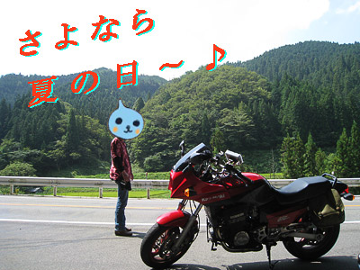 こんばんは。今回は、先日お休みをもらった11/4(水)の時のお話。本格的に寒くなる前に、しっかり疾走っておきたかったので、「琵琶湖一周」の際、風車村で出会った“黒のハーレーさん”に薦めてもらった「三方五湖巡り」に行こう!(^∇^)/って決めました。最近会社に入ってこられた方にも「バイク乗ってるのに、あそこに走りに行ってないなんて!?」って、「三方五湖」ルートを絶賛されたんで、期待を膨らませつつ、当日の朝を迎えました。病み上がり(ただの風邪だったんですけど)のワタシでしたが、冬用のちゃんとしたジャケットを持っていないので、いつもの革ジャンの下に、薄手のタートルネックシャツとロンTを重ね着した程度で『充分かなぁ』って甘~い判断……のちに、この判断が“命取り”になろうとは……( > _ < )さぁて、ナビやレーダーも取り付け、ツーリングバックや電源をつなぎ込もうかと、シートを外そうと、キーを捻った処、負荷無くスルっと空まわりし、シートが浮き上がる気配すらなかった…シート用のキーシリンダーが“バカ”になってしまったようで、シートと格闘すること約1時間、最終的に、シートの隙間にドライバーを突っ込んで、留め金を無理やり解除し、シートを外すことに成功しました。すべての装備をし終え、再びシートを取り付け、『これからは、どうやってシートを着脱しようか?』などど、考える間もなく、出遅れた1時間を取り戻すべく、名神高速 春日井ICへ向けて自宅を9時に出発!高速道に乗って、10分も走らない間に、出掛けの際の“甘~い”判断を後悔していた……まだ11月になったばかりで、朝から快晴だった今日(11/4)「本格的に寒くなる前に」どころか、ビュンビュン強風にあおられ、もう充分「本格的に寒かった」のである。革ジャンを着ていようとも、保温性に乏しい装備だったので、みるみる間に体温は奪われ、奥歯がガッタガッタ鳴り出したのだった。ただ、そんな状態だったとはいえ、小牧JCTから、BMW K1200S と オレンジの ロードグライドの2台が合流してくると、この寒風と闘う“同志”が増えたみたいで、なんだかとても嬉しくなってきました。(*^-^*)欧州とアメリカの違いこそあれ、2台とも生粋のツアラーなので、それほど風圧の影響は無いのかもしれませんが、ハーフカウルの日本の“Ninja”も、負けじと頑張りましたよ!お互いに遠慮しあってるのか、一定の“流れ”以上にペースを上げようとしないので、ジレたワタシが“右手”をグゥンと捻る。腕から、顔から、身体から、まともに寒風の圧が打ち付けてきて、もう鼻水も、自制心も止められない状況に!にもかかわらず、そんな状況に追い込まれても必死に耐えている自分が、妙に面白く感じ、愉快で愉快で、グラつくシールドの中でニヤニヤニヤニヤしておりました。しばらくして遅いペースの車列の後尾に追い付くと、ワタシの集中力がガクっと切れてしまったので、あとは彼らにペースを任せて、引っ張っていってもらいました。養老SA付近で、2台がペースを落とされたので、ここまで楽しく引っ張ってきてもらった事に感謝しつつ、再び単独で、寒風との闘いを開始。追い越し車線を無理せず、前車の流れに付いて走っていると、高速道でいつも現れるのは、ピタ~っとその鼻っつらを詰めてくる“高性能”な車に乗る“低脳”な運転手さん。そんな時、比較的の分別ある“低脳”なワタシは、車間の空いた走行車線に戻り、そこから一気に加速し、ミラーの視界から引き離してやる。「やられたら、やりかえす」のが“低脳”な者たちの哀れな習性。しばらくすると、またピタ~っと、ミラーの視界に割り込んでくる。そしたら今度は、スッとどいて、ソイツを前に行かせてあげる。お下品な車間の詰め方に、一般車両がドンドンどいて、車線上に遮る車がいなくなり、ソイツが加速を開始する。今度は、ワタシがお下劣にソイツの背後にピタっと着いてやる。今までの経験上、そんな運転手さんたちは、直線は、元気に頑張るものの、伊吹付近のRがキツ目のコーナーや下り坂で、一気に背後に追い付いてやると、今度は向こうが、すぅっと車線を譲ってくれる。『判ればヨシ!今度から、無闇矢鱈とバイクをいぢめないでネ!!』てな“低脳”な小競り合いで、脳内でエンドルフィンを分泌させ、そんな脳内麻薬で、“寒さ”の感覚を麻痺させつつ、無事、北陸道 木之本ICに到着!( ̄▽ ̄)ゞそれ以降の道中は、また別のお話で。091104 名神 春日井~北陸道 木之本