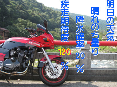 明日の名古屋近辺の天気予報は、 「晴れ のち 曇り」 降水確率 午後から20% のようです。明日は、急な仕事も避され、休日が確定したんで、往復200km程度の小さめのツーリングを慣行しちゃいます!名付けて「ワン満 ツーリング」( ̄^ ̄)vって、言うのも、ワタシの“赤兎馬”は、出発時にガソリンを満タンにしとけば、200km程度なら、その後のガス補給無しで走って帰って来られるからです。んなわけで、<CS3K>を携帯して、明日こそ本格的に疾走ってきますネ。(o^-')b