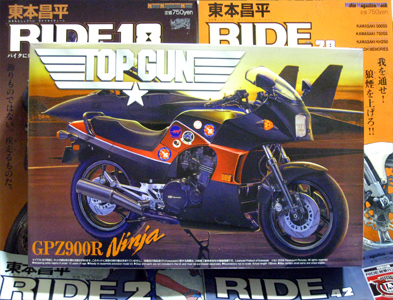 昨晩フラっと、いつものブロンコビリーへ、仕事帰りに訪れてみました。店内に入ると、ワタシの顔を見つけたバンビちゃんが、テーブルまで案内してくれた後に「あ!そういえば、渡したいモノがあるんですぅ♪」って、意表をつくセリフを残して立去って行きました。内心『え゙っ!!(☆_☆)!』って心の動揺を抑えつつ、ドキドキしながら待っていると持ってきてくれたモノは、"Ninja"のプラモデルの箱でした!!!(≧∇≦)『え゙え゙っ!スゴっ!でもなんで??』再び意表をつかれて、言葉を失ってしまっているワタシに、バンビちゃんは「これ、以前ご一緒されてた<ハーレー>さんが、先日持ってきてくれたんですよ。」このプラモデルが、映画「TOP GUN」仕様の絶版らしいこととか、<ハーレー>さんの元気そうなご様子とか、<ハーレー>さんがツーリング先でも、青い"Ninja"に出会われてお友達になったことなどを丁寧に説明してくれて、すべて納得、了解しました!なんでもハーレーさんは、あの日以降もちょくちょくこのお店に立ち寄られているようで、ブログにも何度も紹介しているワタシのためにって"置き土産"として"Ninja"のプラモを託していったそうです。まずはブログにて、恐縮ですが「ハーレーさん、どうもありがとうございました~。」( ̄▽ ̄)ゞハーレーさんからもツーリングのお誘いのメールを頂戴してたんですが、土日も出勤が多くて、突発的に休日をとるようなワタシの仕事柄、なかなか予定の調整ができないんですが、近々、"Ninja"のお礼かねがね遊びに行こうかと思います。 追伸、店長さ~ん、ボクの乗り付けている"Ninja"は"意外"にスリムで小柄すけど、「ニーハン」じゃないですよ~。列記とした「900cc」ですっ( ̄^ ̄)ゞでも、毎回一人で食事にくるワタシにも気さくで丁寧に応対して頂けるんで、ホント感謝してます。(=^・^=)今度は会社の同僚なんかも連れて行きますので、その節はよろしくお願いしま~す。