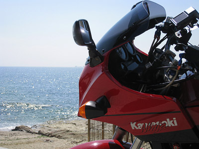 自分への「戒め」として、これを書くことにします。 その日4/24(日)は前日の雨が上がり、快晴の春の陽気で、 いつもの革ジャンの重い「鎧」をまとうことなく、 スカジャン+フリースの「軽装備」で、 "赤兎馬"と共に、知多を目指し出発。 その日は、自分もバイクも非常に調子よく、 と言より、その日の自分はあきれるほど、 「調子にノって」疾走っていました。 海岸付近の往路では、Ninja+750ゼファーの2人組を気持ちよくパスし、 帰りの知多半島道路では、巡航中の"赤兎馬"のテールに 強引に絡んできた「旧車」のCIMAを一旦先行させた後、 相手と同じ手法で、向こうが観念して車線変更するまで 尻を小突いて、加速しながら追い抜いてやり、 「やりたい放題」に疾走りまくってました。 そんな「傍若無人」な自分に、<天罰>が下ったのは、 ツーリングを終え、家の近所で給油しようと、スタンドに向かってる時でした。 あと、数百mでスタンドという交差点に差し掛かった際に、 すれ違ったバイクに気を取られていて、 前方の信号が赤に変わったのに気付くのに遅れ、 咄嗟にFブレーキを掛けた刹那、 浮いた砂ジャリにフロントがロックし、 そのままフロントが右へ流れました。 さほど速度は出てなかったので、 なんとか転倒するのを左脚でグッとこらえたのですが、 230kgの車体をそのまま立て直すことはできず、 泣く泣く"赤兎馬"をゴロンと路上に寝かせることに...。 交差点の車線をふさぐように転がしてしまったため、 急いでに車体を引き起こそうと、一気に力を込めた時、 腰が「ゴキり!!」と聞いたことの無い悲鳴をあげ…… 腰に鈍痛が走ったのですが、再度転がしてしまったら、 引き起こすのは不可能だと思い、何とかそのまま、車体を引き起こし、 路側帯まで押し引いて行きました。 何とかエンジンもかかり、自走できたので 曲がってしまった左ステップに違和感を感じつつ、 なんとかそのまま帰宅できました。 家に帰ってから確認すると、 不思議とカウルやウインカーには一切の傷も無く、 ハンドルバーエンドとエンジンに細かい傷がある程度で、 左ステップが、すべての衝撃を吸収してくれたようでした...。 それは、あたかも"赤兎馬"が自らのカラダを張って、 大きな事故につながる前に 調子に乗っているワタシを「戒め」てくれたようでした。 幸い、ステップもハンマーで叩き直り、 ワタシの腰も、筋肉を傷めた程度の 軽めのギックリ腰で済みました。 まだしばらくはバイクにまたがれないけど、 この期間に少し今までの自分を 振り返ってみようかと思います。 運転技術も、運転の心構えも ぜんぜん未熟!本当にゴメン、 そしてありがとうな、"赤兎馬" …とは言っても、でもこんなもんぐらいじゃ、疾走るをのヤメるわけないんですけどネ