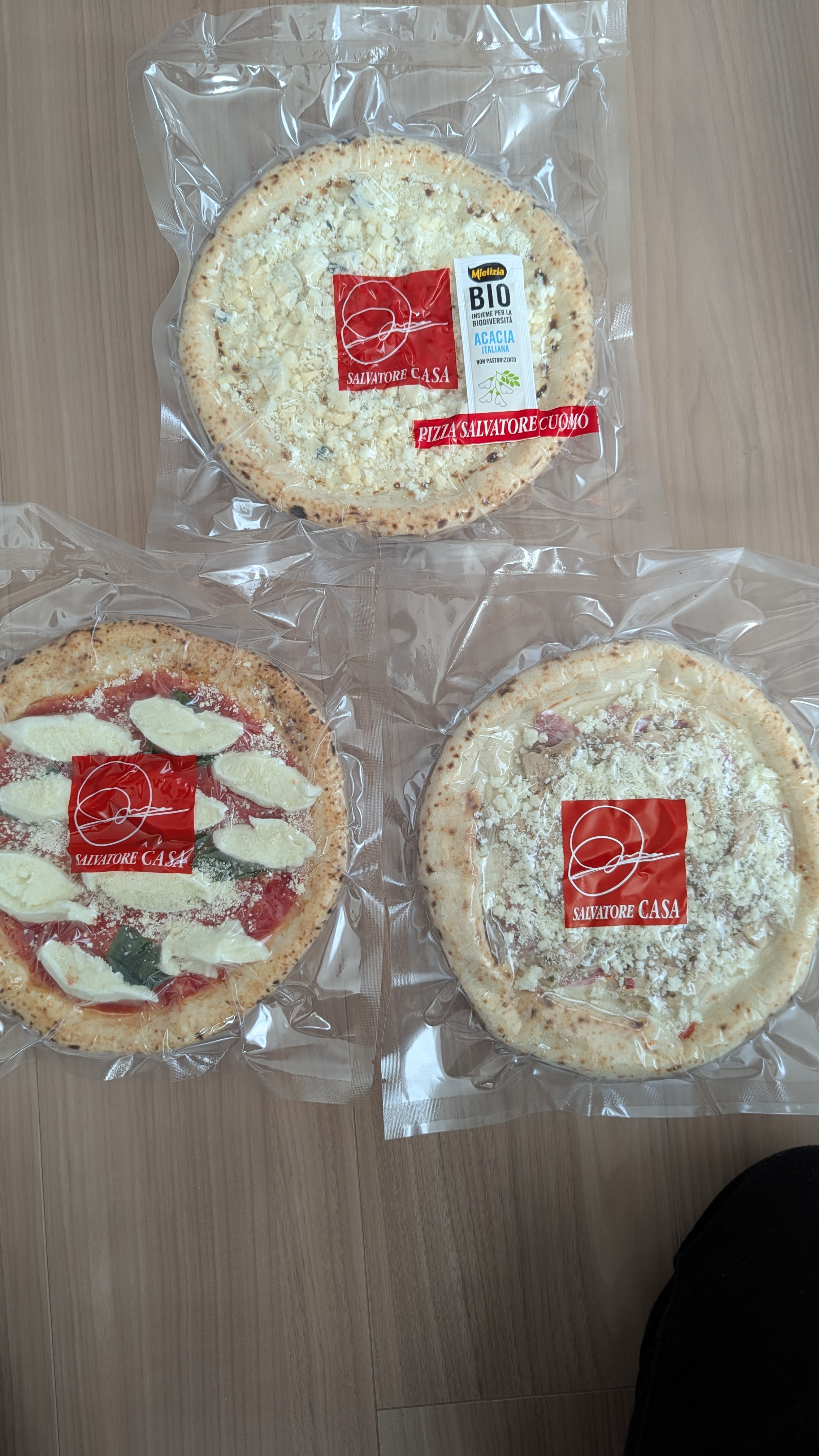 開けてみるとこんな感じで。オーソドックスな3種のピザが入っています。