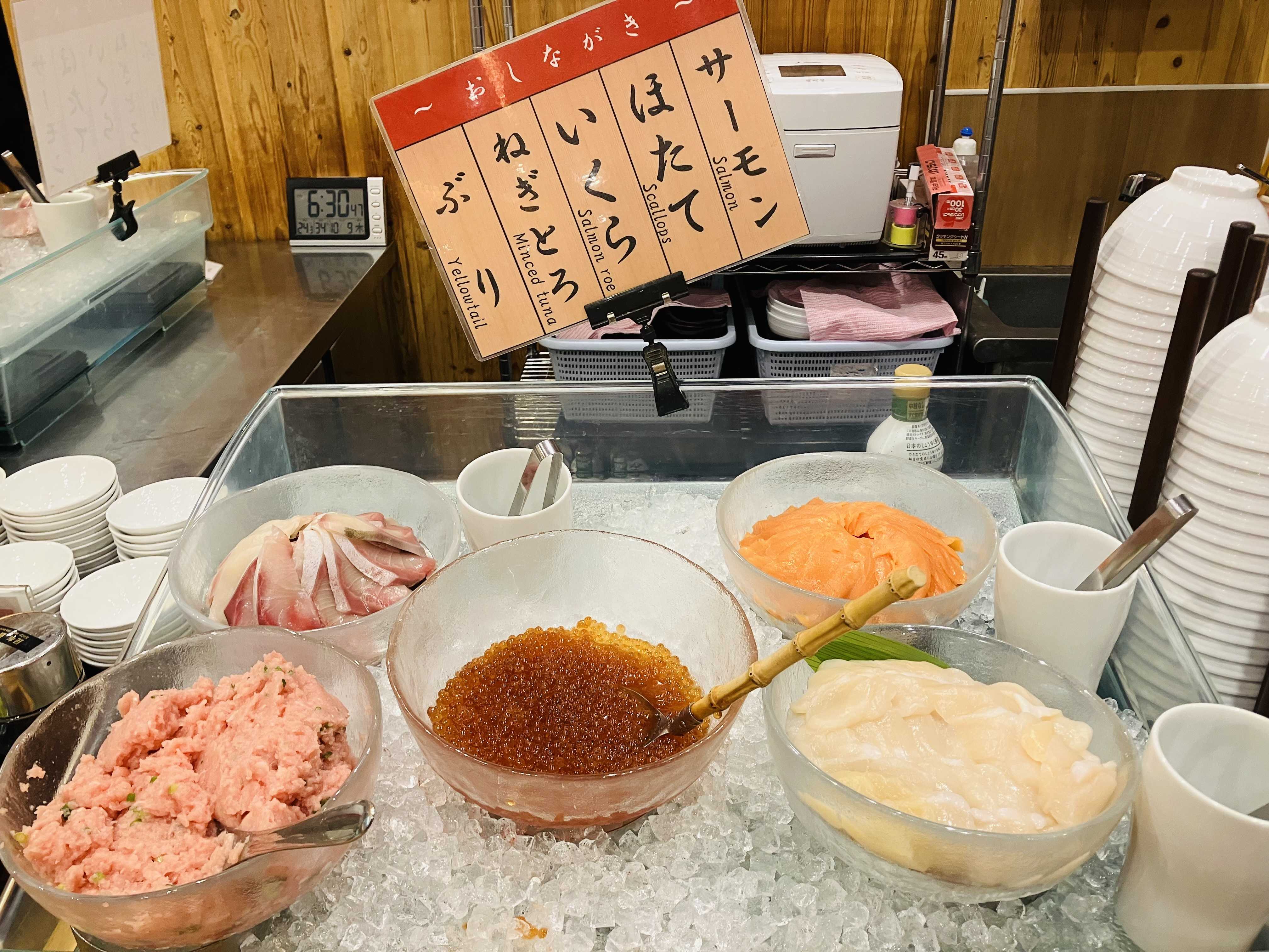 三角市場は朝8時から営業です。朝ごはんは滝波食堂。好きな海鮮が選べるわがまま丼が推しですが、朝は焼き魚系食べたい。8時開店で8時に到着しましたが、すでに店内活気溢れてる!並ばず入れましたが、焼き魚系は注文殺到で20分から30分待ちです。注文後、待っている間に自宅への配送を手配。私はイカが食べたくてイカ焼き。定食セット440円をつけました。ご飯少なめで。着席するとホタテヒモが出され、定食はご飯と海苔みそ汁、たくあん、サーモンネギトロ、焼き鮭でした。イカが肉厚でたまりません✨友人はホッケ半身定食。ホッケデカい🐟ホカホカご飯にサーモンネギトロを乗せて醤油を垂らすと、もれなく幸せです✨帰る頃には行列になっていたので早めの来店がおすすめ。さて、しっかり元気チャージしたので8時50分の電車で発寒に向かいますよー🚃目的はアウトレットのお菓子🍭さらば小樽。また来るね😆