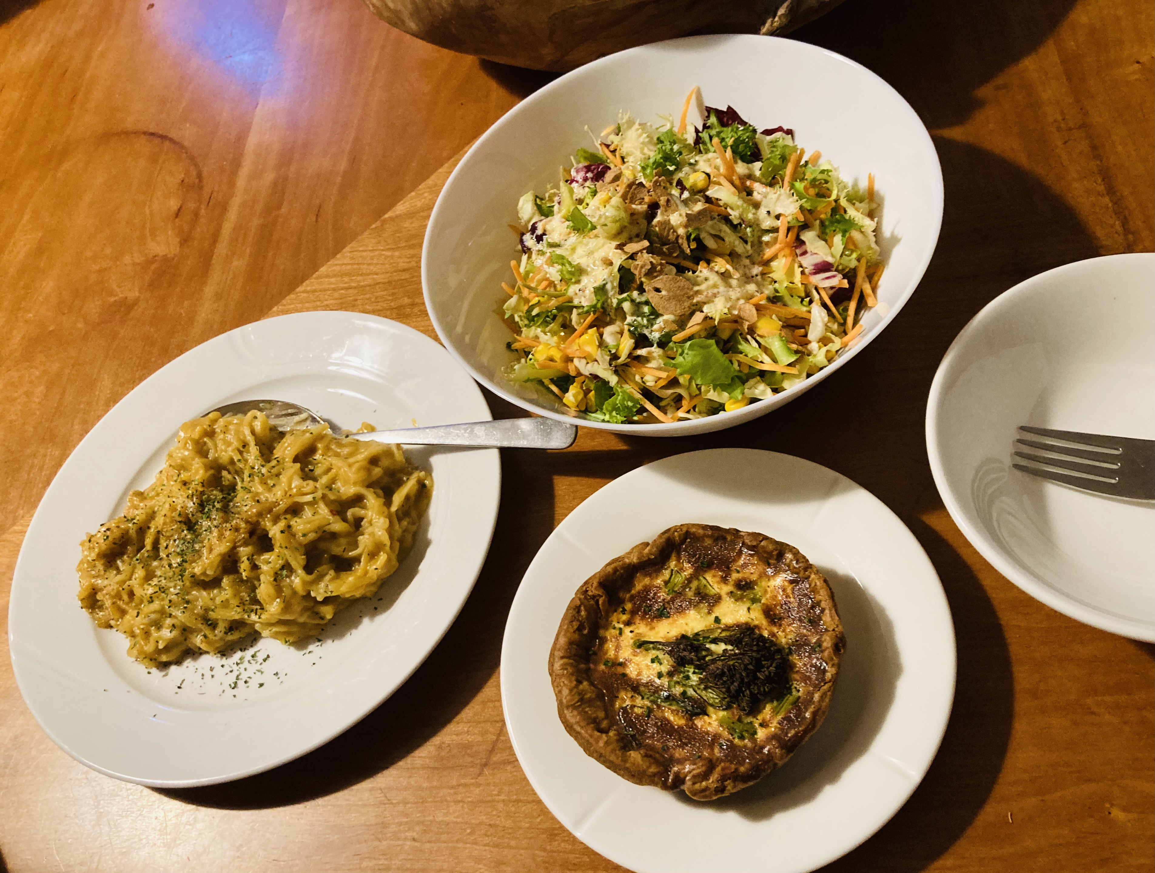 今日はサラダとパスタにスープ、昼に買ったキッシュにします。