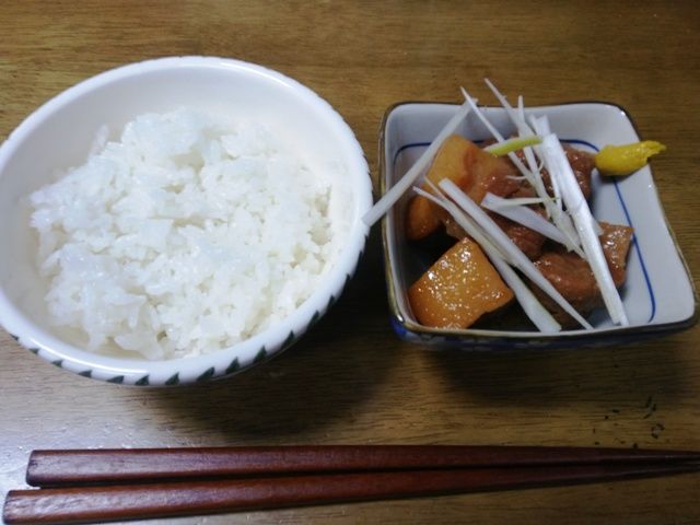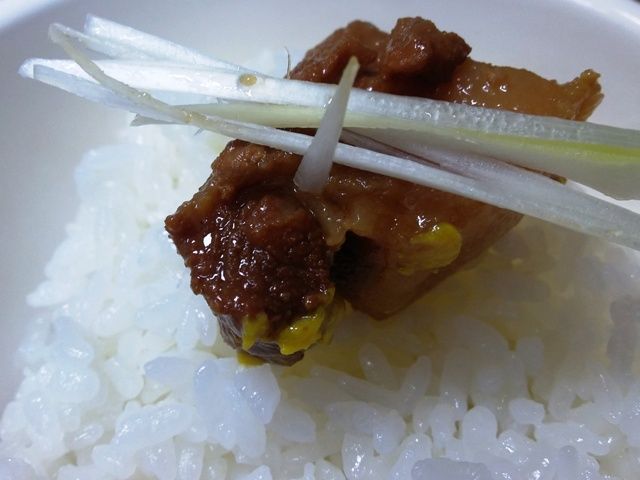 で、ご飯だけではイマイチなので朝から作っていた韓国産サムギョプサルのブロックで作った豚の角煮と一緒にたべてみます!(実は角煮、サムギョプサルのスライスを注文したのに、スーパーの宅配でなぜかブロックが来てしまい、苦肉の策?!で角煮を作ることに…笑)