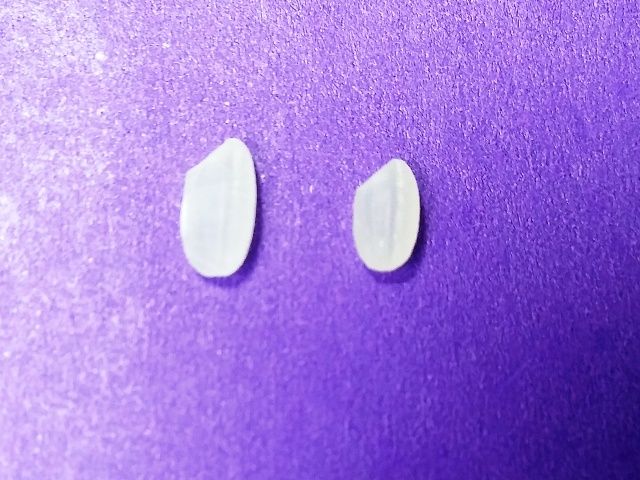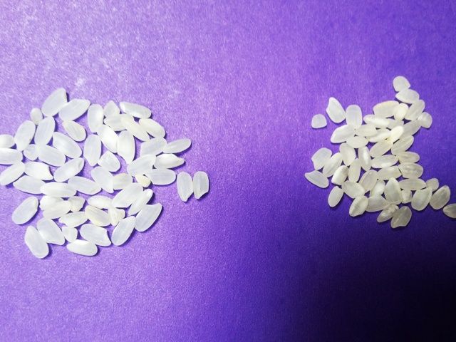 一粒ずつ並べてみるとよくわかります。左が新東津米、右が韓国産コシヒカリ。