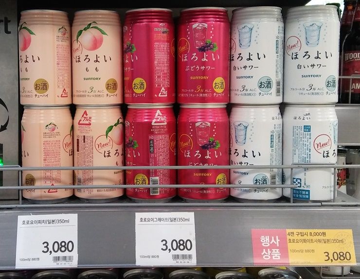韓国ではここ数年、炭酸系アルコール、日本風にいえばチューハイ人気が高く、ドイツなど欧州系メーカーの炭酸入りのワインとか韓国国内生産ものが随分増えてきたのですが、最近では日本直輸入のものが増えてきています。「ほろよい」もその一つ。