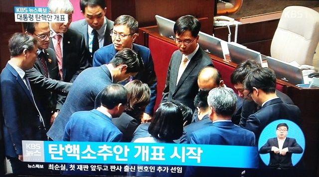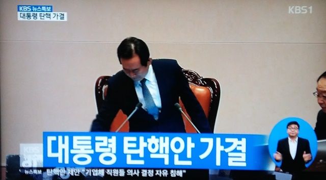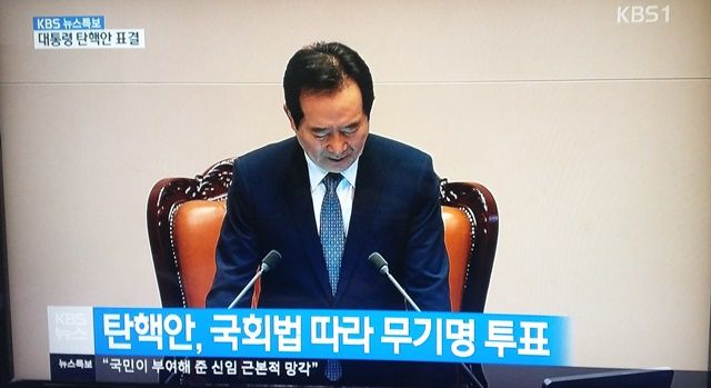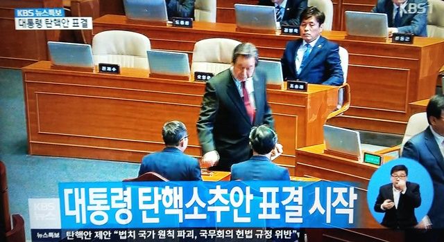 9日午後3時から行われた韓国国会本会議で朴槿恵大統領弾劾訴追案が投票総数299票、賛成234票、反対56票、棄権2票、無効7票で総議席数300議席の3分の2以上となったため可決。野党・無所属計172人を大幅に上回る賛成票で、与党セヌリ党の半数近くも朴大統領の弾劾訴追案賛成に回った模様。