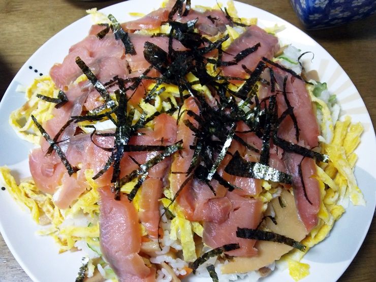 で、とりあえず無事にスモークサーモンを使ったちらし寿司は完成・・・・