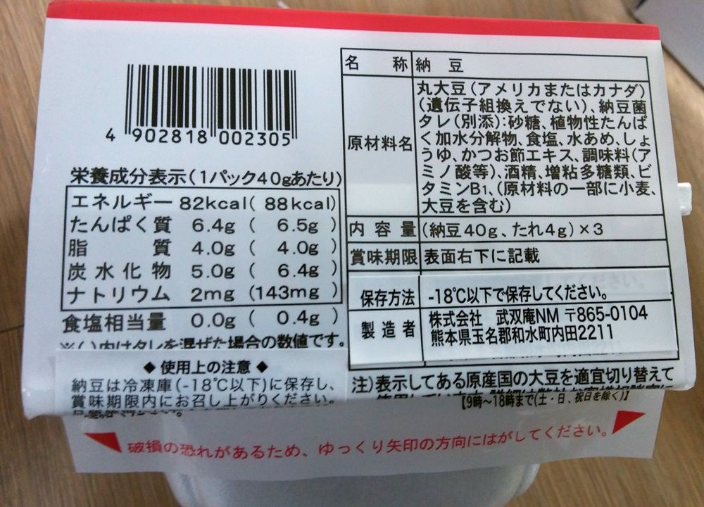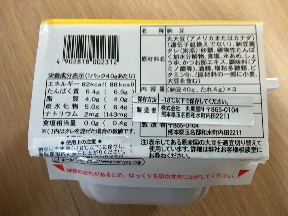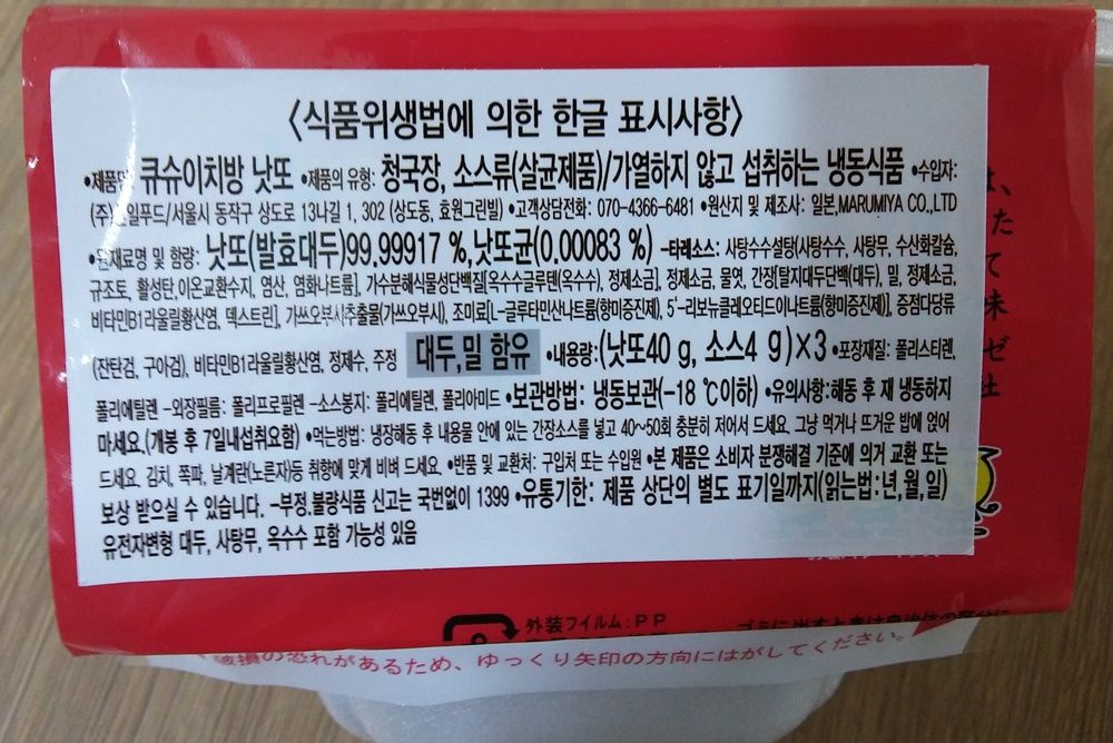 」の表示。韓国語が反対側にあって日本語表示もそのまま。海外輸出用は冷凍で販売されるのでその所がシールで後で貼ってありました。こちらはお城納豆の会社の丸美屋さん。