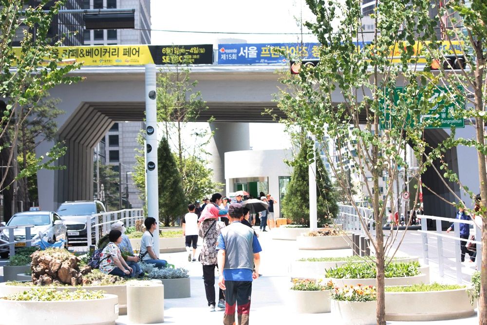 会賢駅から出てソウル路に入りソウル駅方面にちょこっと向かったところ。大通りの中央分離帯にこの散策路が出来たので両サイドに車が走ります。