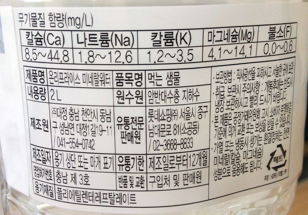 最高値と最低値の差があるので、採水時期によって軟水~硬水(WHOガイドライン)、軟水~中度の硬水(中硬水)(一般的な基準)と軟水の時もあったりそうでなかったりと差が激しい感じになっています。(ソウル首都圏や近郊で採水したミネラルウォーターの場合、時期によって水の硬さに差が出るものが多い傾向にあります)