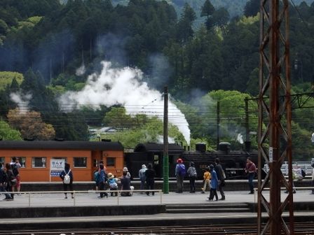千頭に到着すると汽笛の音が聞こえる。駅に向かうとそこにはSLが勇ましく蒸気を吹き上げている。